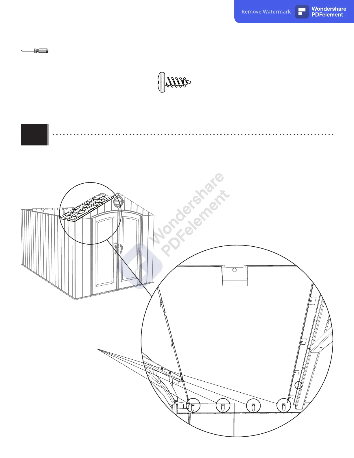 • Align the four holes in the Wall Panel with those at the bottom of the Roof Panel, and insert four (4) Screws (ADZ)