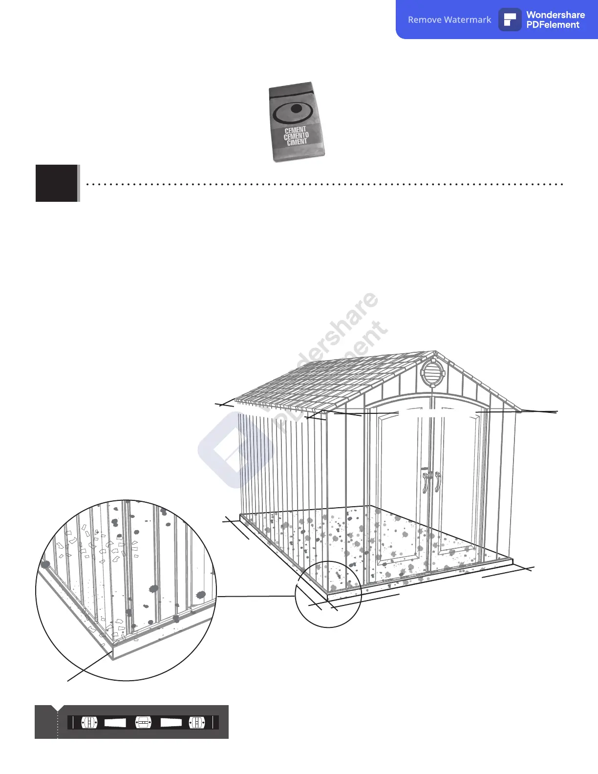 • The concrete should be approximately 4" (10,2 cm) thick. The actual dimensions of the shed, at its widest
