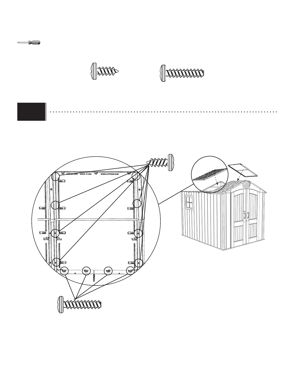 • Set a Roof Panel onto the Gable, Wall Panel, and Truss Assembly, and secure it with the hardware shown. Only