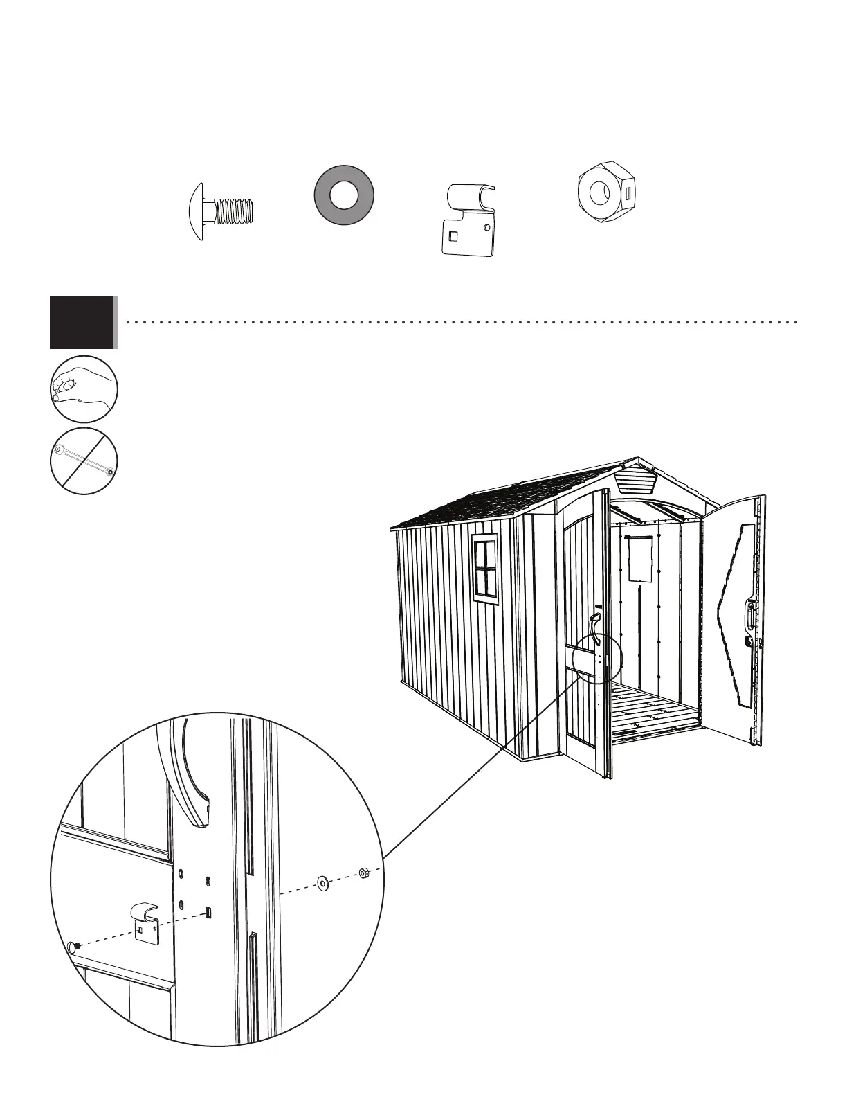 • Seulement après avoir ancré votre abri, attacher le support gauche du loquet (CVT) à la porte gauche à l’aide de la