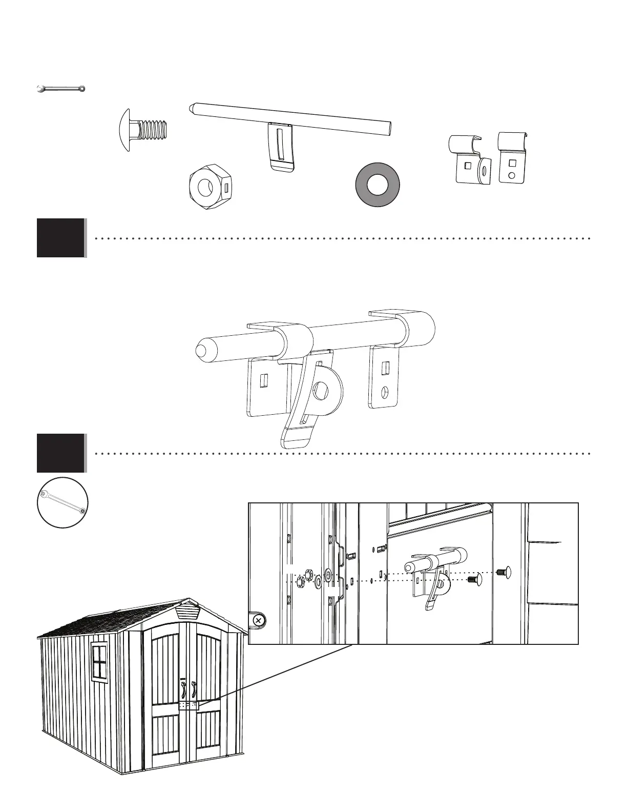 • Attacher l’ensemble du loquet à la porte droite à l’aide de la quincaillerie incluse. Serrer bien ces écrous.