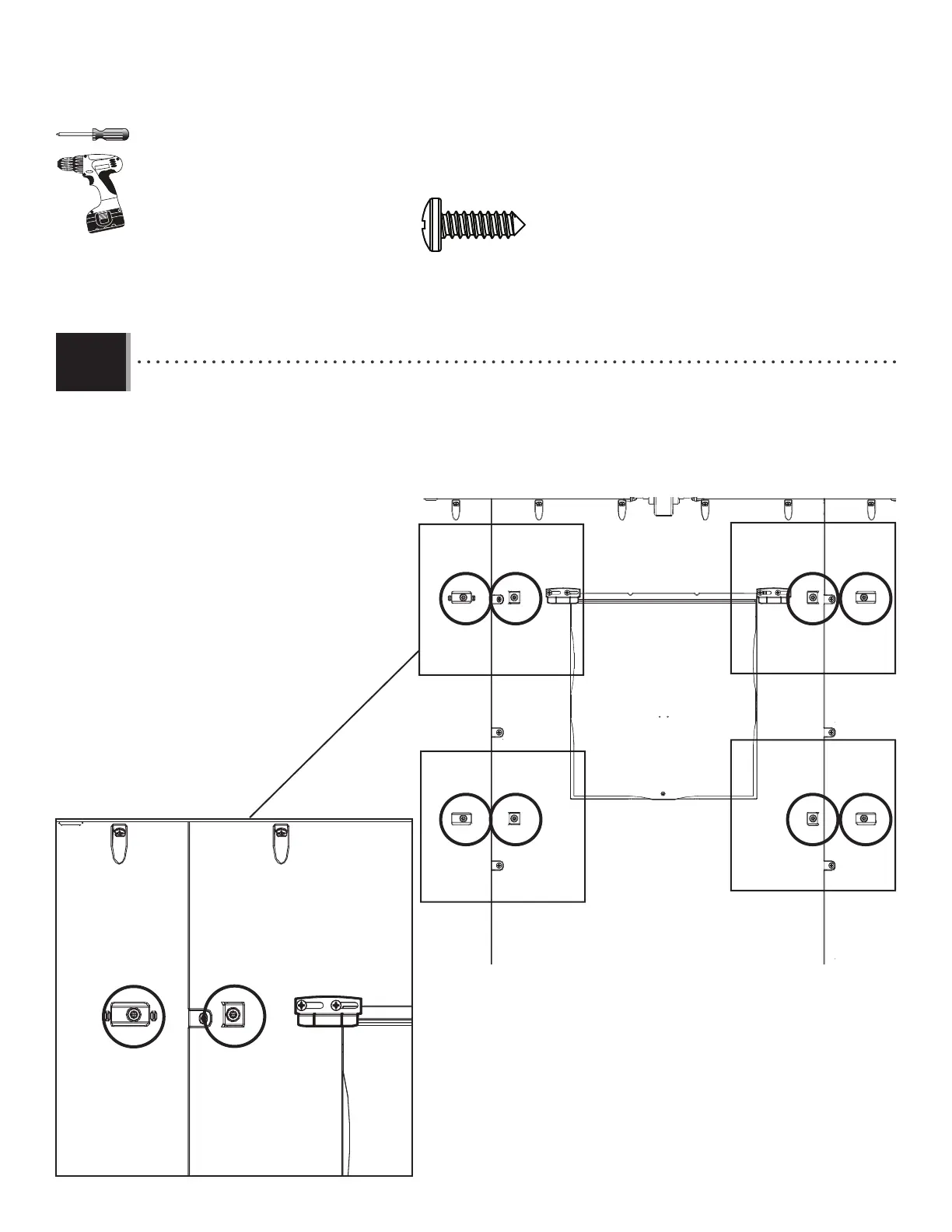 • Il y a quatre groupes de deux indicateurs pour l’emplacement des vis. Une par une, insérer les vis (ARV) à travers les