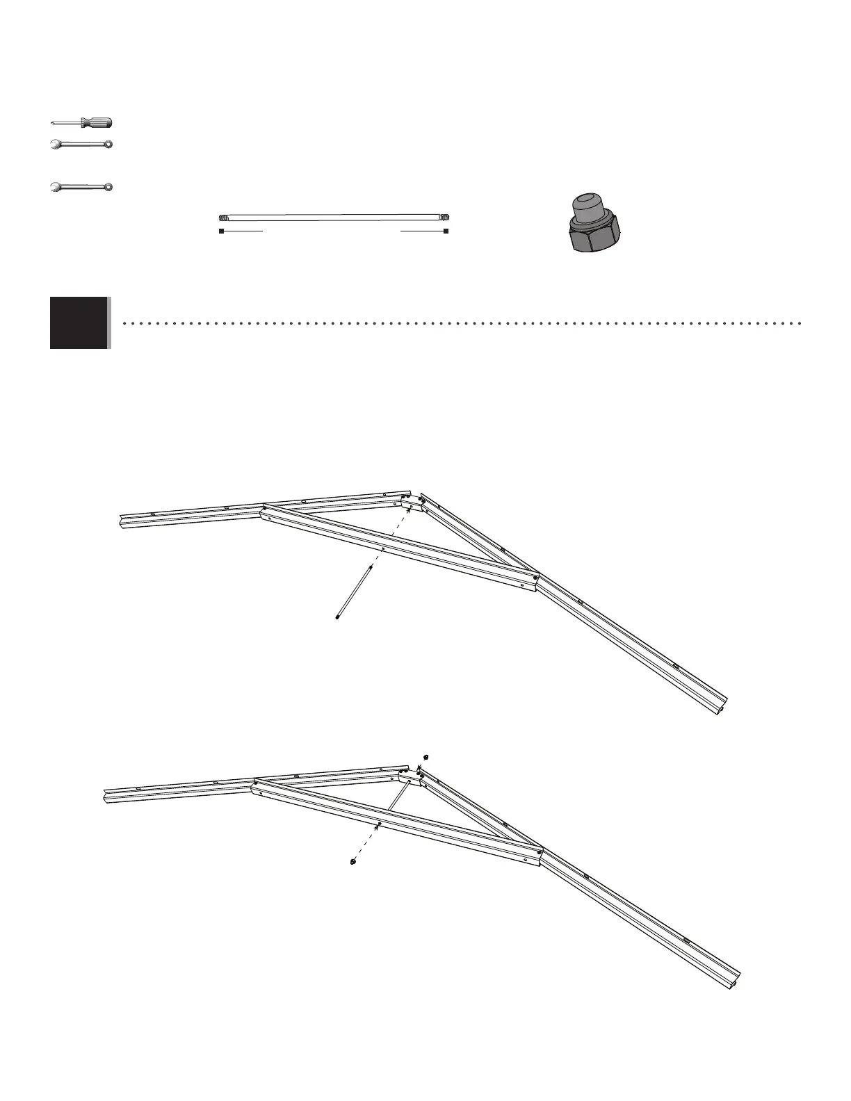 • Slide a Truss Rod (ADH) through the holes in the Truss Brace and Connector. Secure with two Cap Nuts (ADJ). Lay Truss