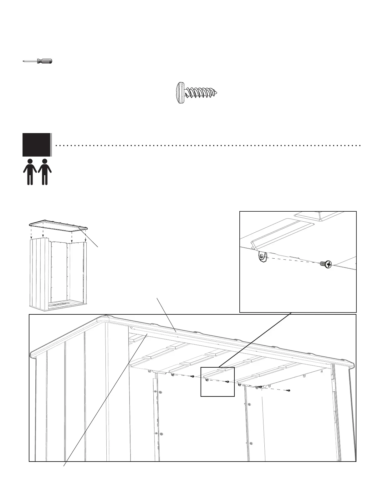 Support is over the opening. While one adult holds the Roof in place, secure the Roof to the right Rear Wall Panel using four (4)