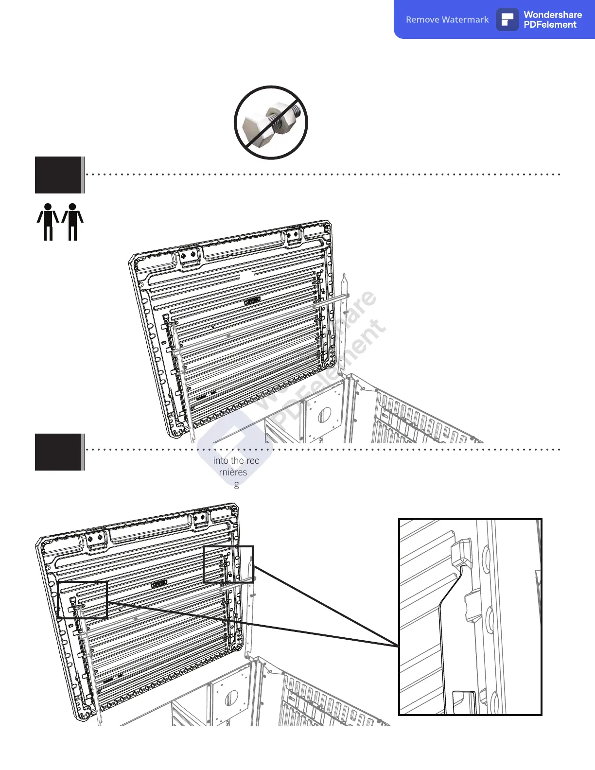 • Mandater deux (2) adultes pour déposer le toit (AGQ) sur les charnières et le maintenir en place.