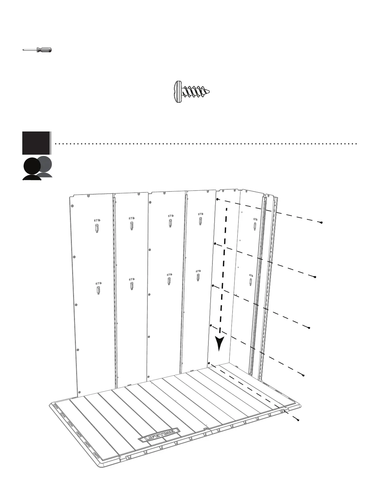• Tirar el panel hacia abajo hasta que la lengüeta se encaje en la ranura. Fijar los paneles el uno al otro usando cinco (5)