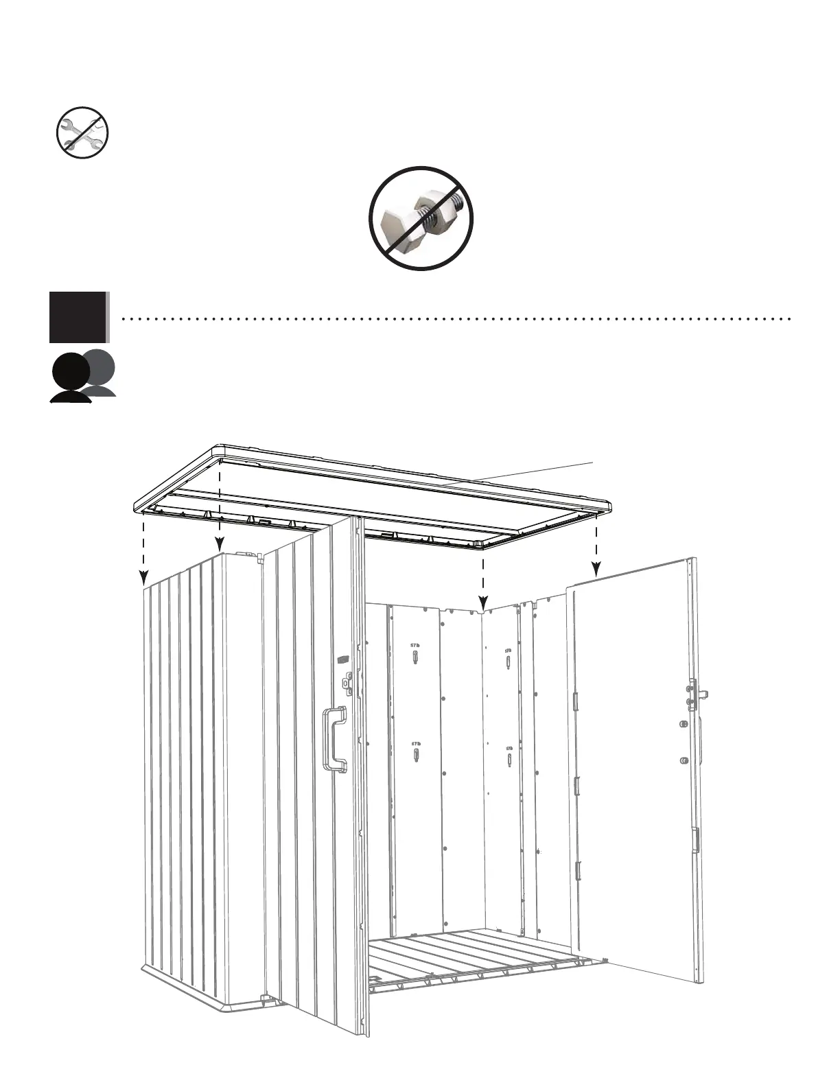 • Ouvrir les portes comme indiqué. Orienter l’assemblage de toit comme indiqué et le mettre sur les murs de l’abri.