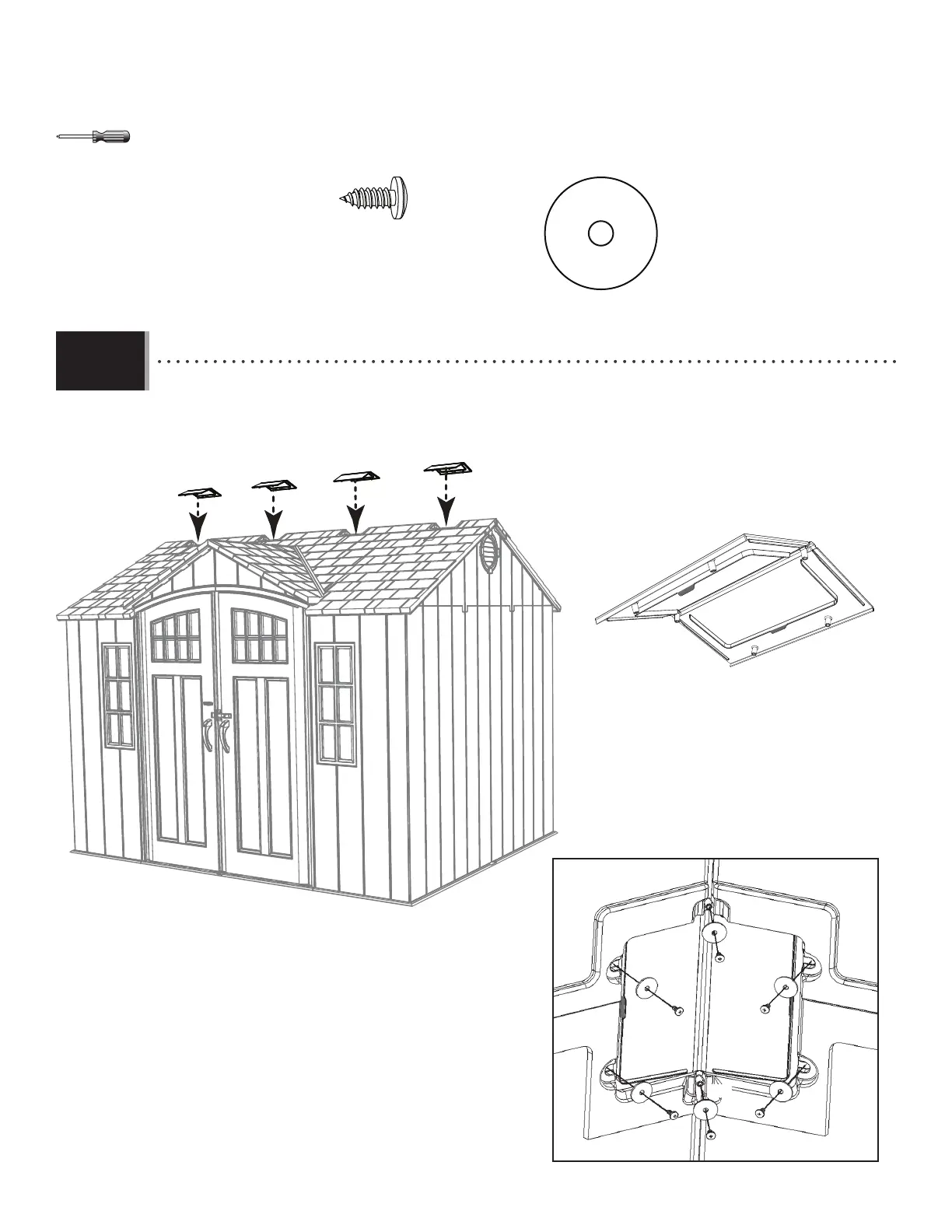• Plier les lucarnes (AHC), et fi xer-les au toit à l’aide de six (6) vis (ADX) et rondelles (AED) pour chaque lucarne.