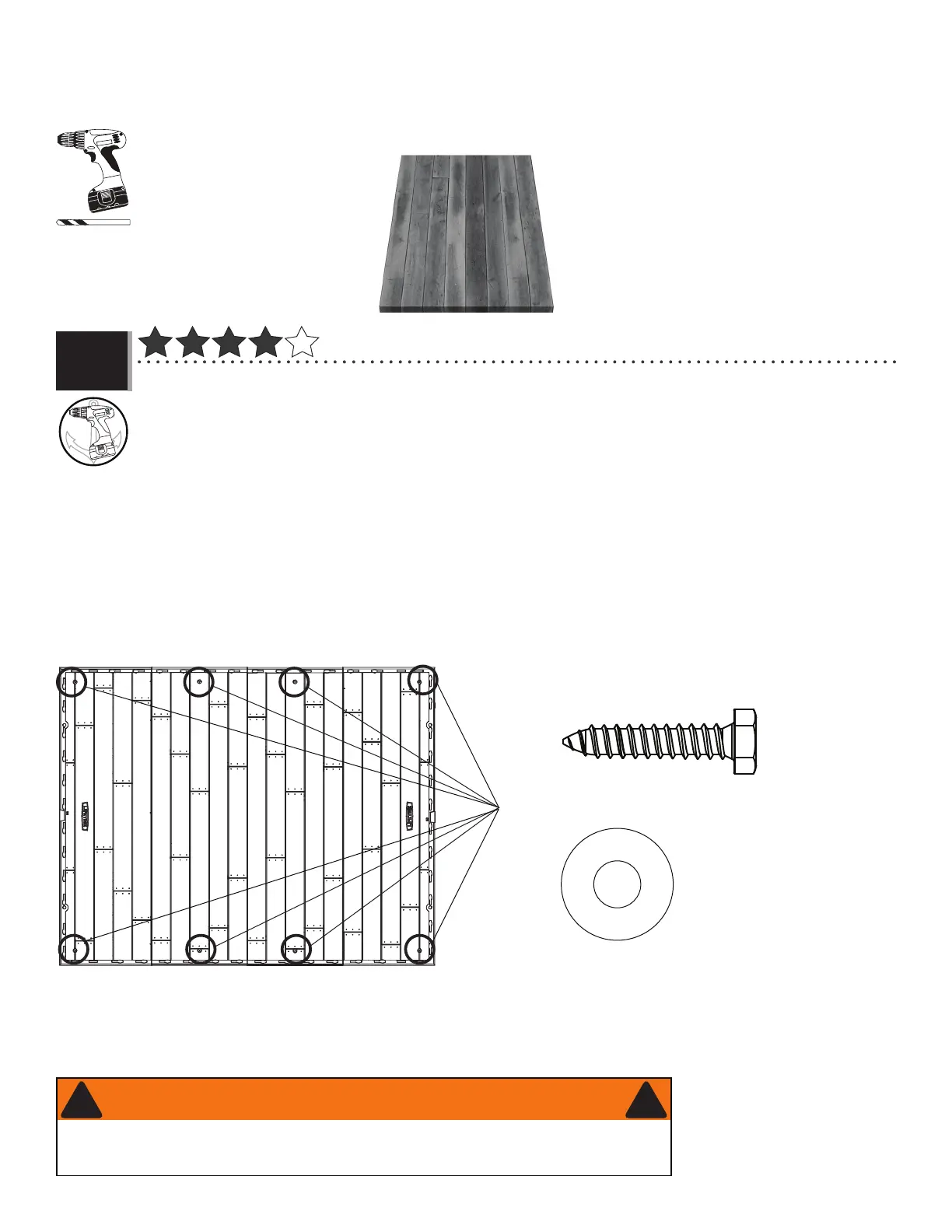 recommend using a drill, 5/16" (8 mm) drill bit, eight (8) 3/8" x 1 1/2" (10 mm x 4 cm) Lag Screws and eight (8)