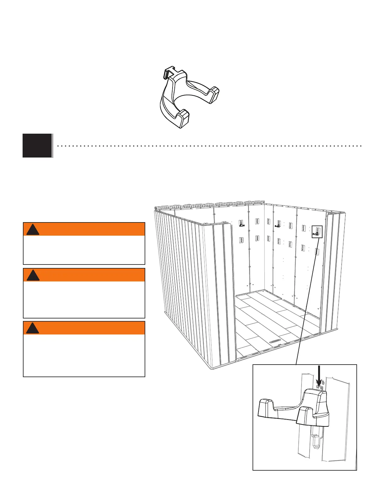 • Insert the six (6) wall hooks (GKU) into any of the notches in the wall panels (any wall of the shed). Then push