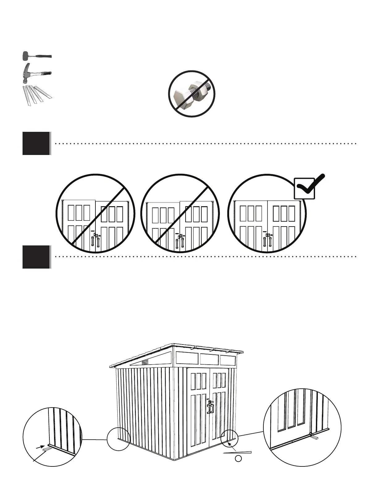 bottom corner of the right door and/or the left rear corner of the shed. If necessary, repeat for the left door until both