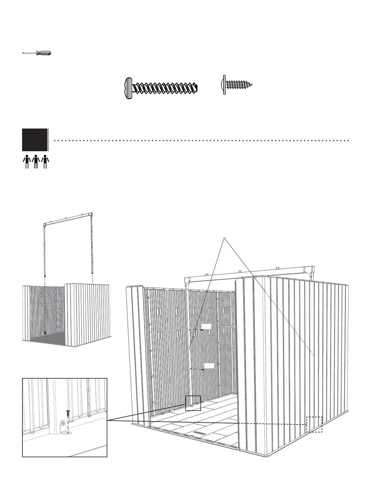 • Set the beam assembly from steps 2.1–2.3 into place. Align the holes in the wall panels with those in the vertical supports and