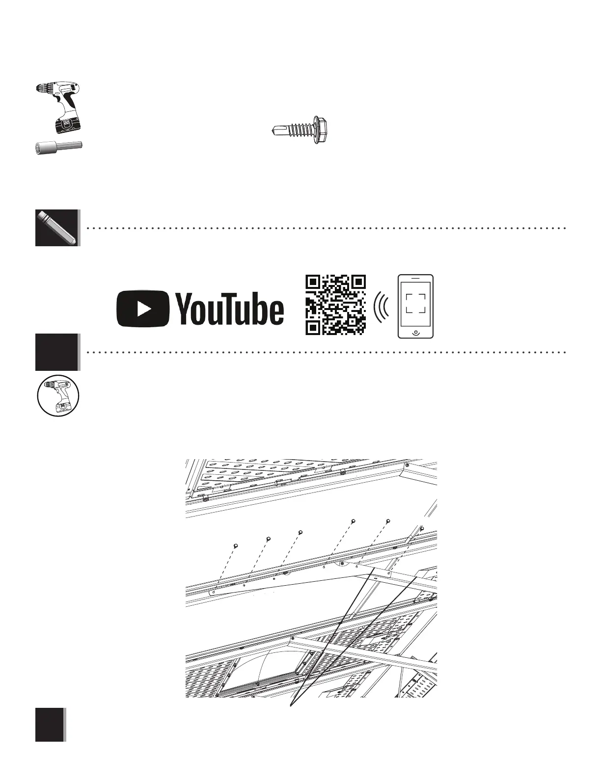 • Set a Gusset (BQW) up against a Truss as shown. Using an electric Drill, insert four Screws (BRK). Repeat this step for