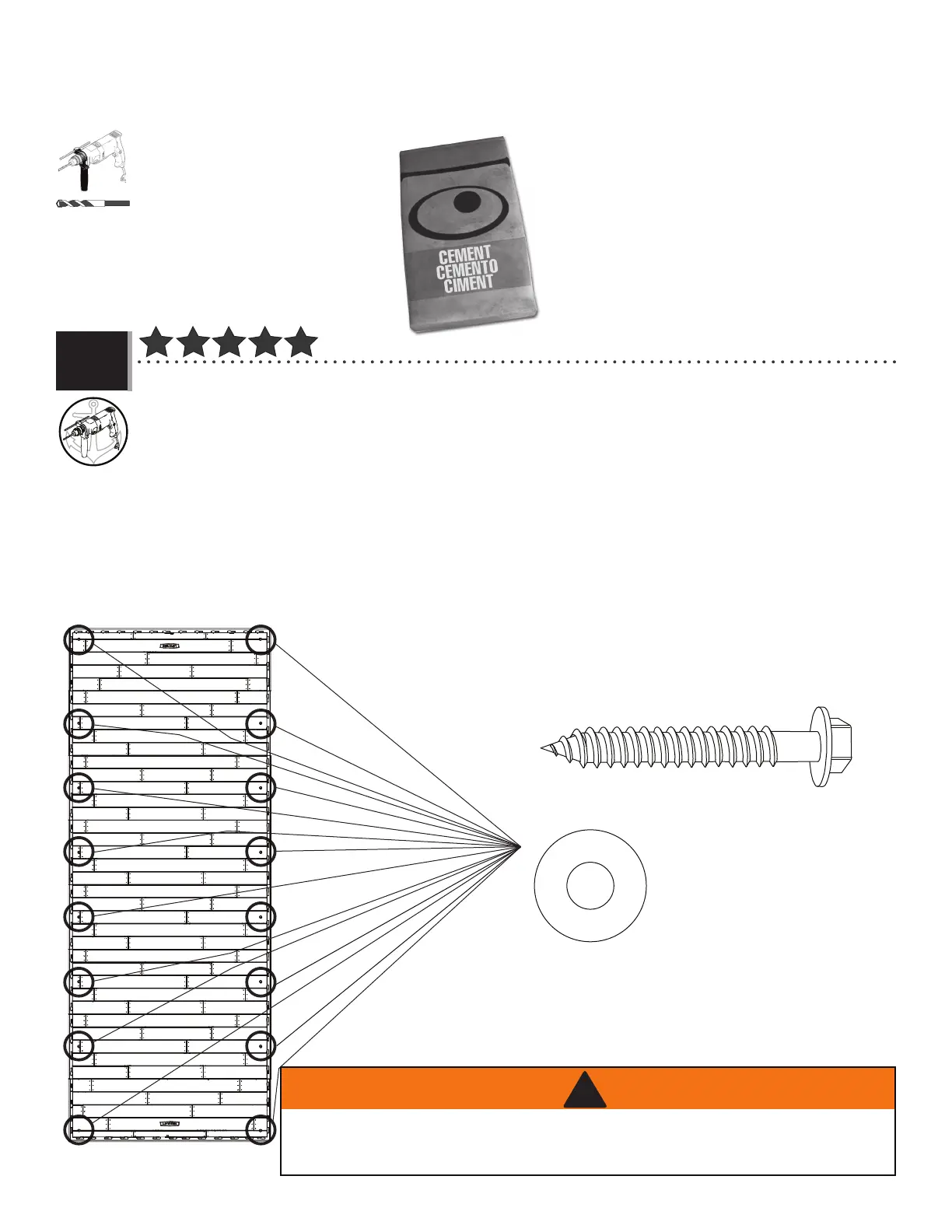 Concrete Screws and sixteen (16) 3/8” x 1” (≈10 mm x 2,5 cm) Fender Washers. Do not exceed a 3/8” diameter