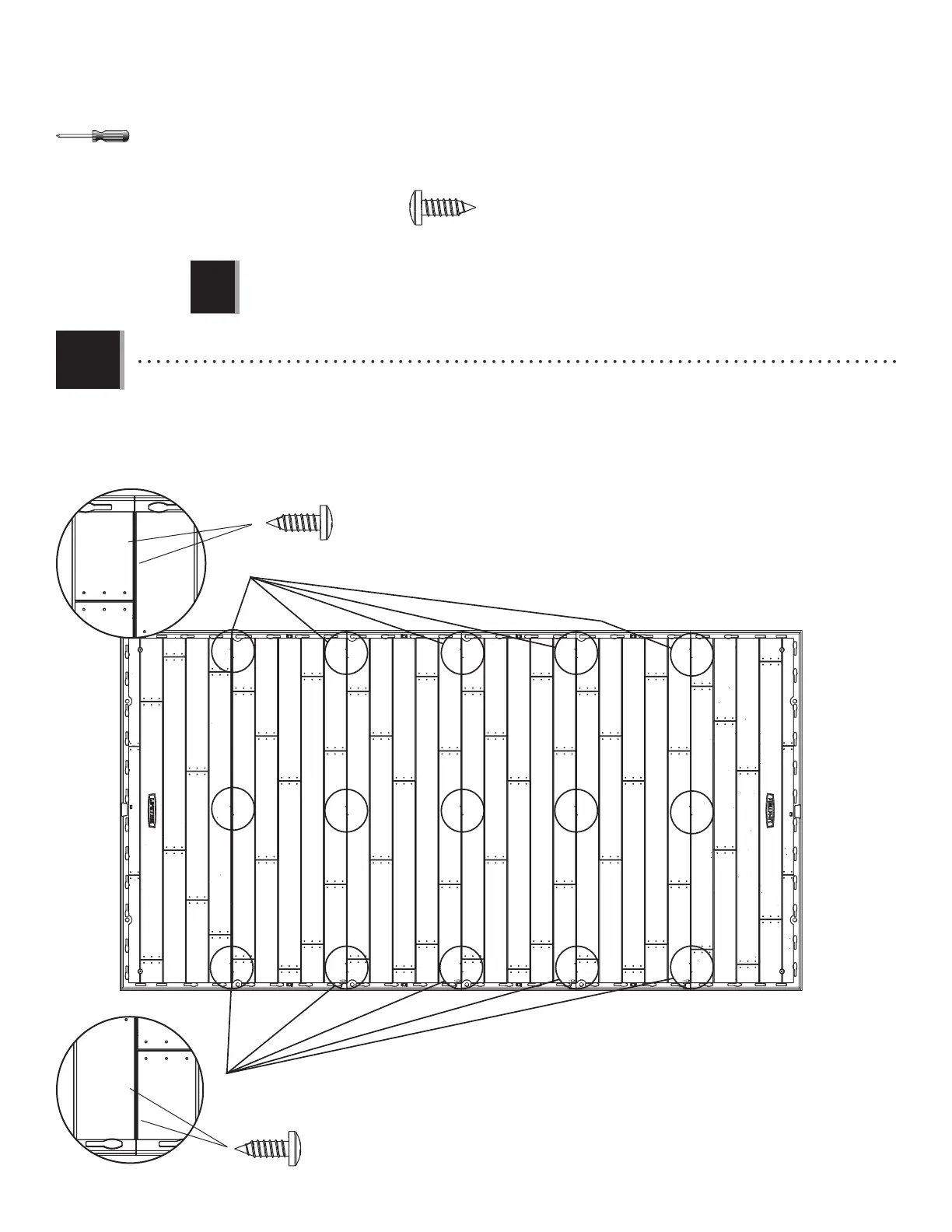 • Insert the screws (BQC) through the divots in the fl oor panels and into the tabs of the adjacent fl oor panels. (The