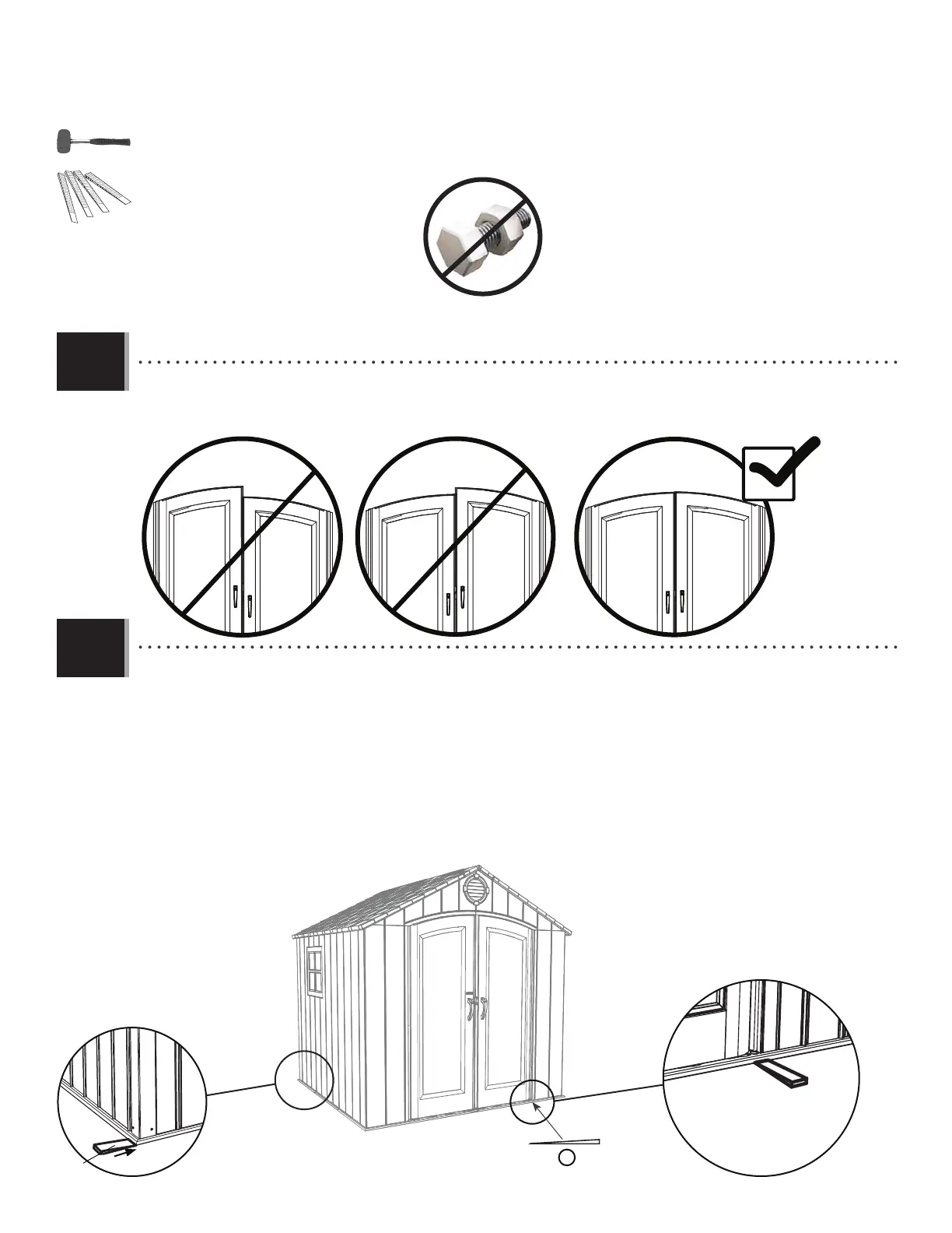 bottom corner of the right door and/or the left rear corner of the shed. If necessary, repeat for the left door until both
