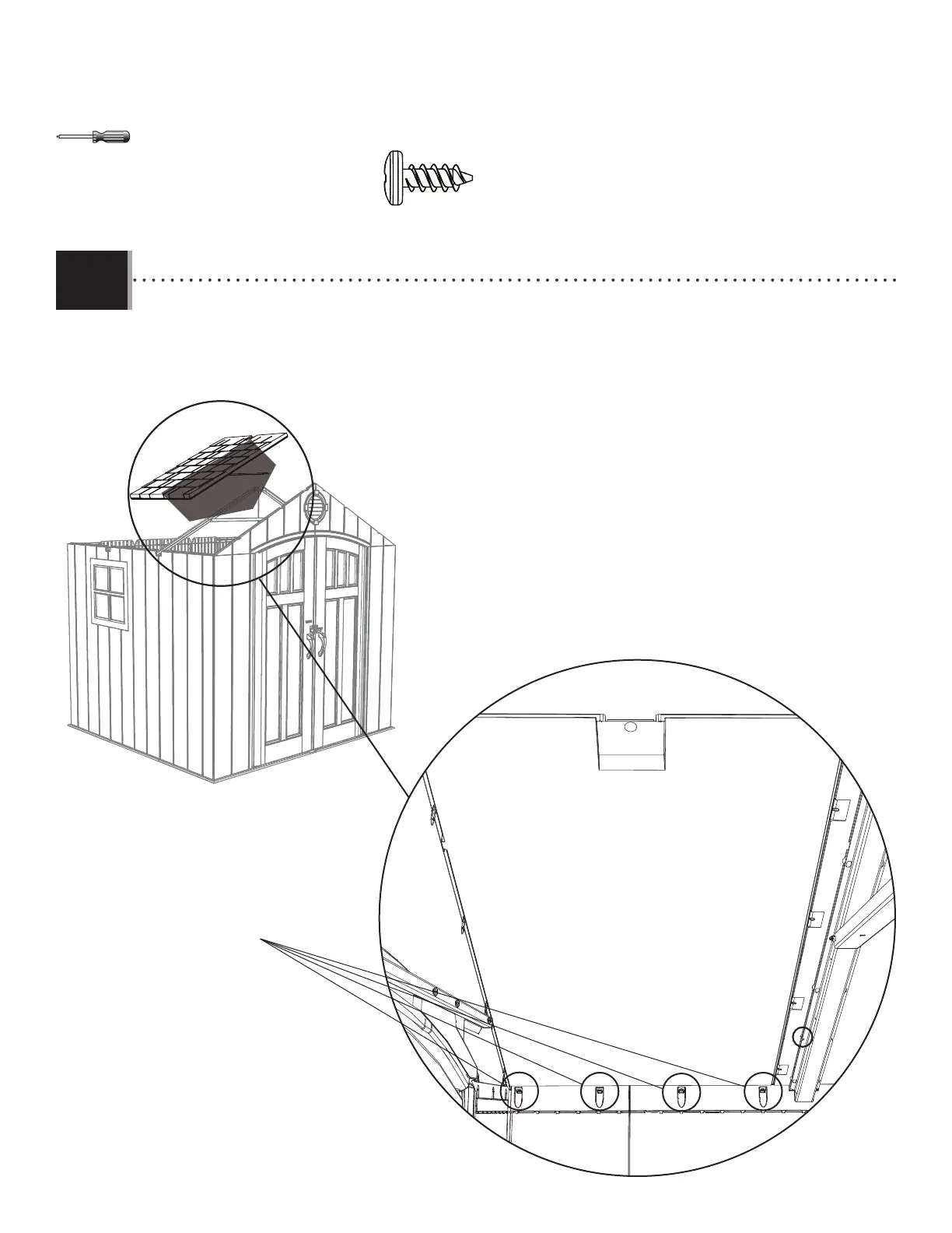 • Align the four holes in the wall panel with those at the bottom of the roof panel, and insert four (4) screws (ADZ) to