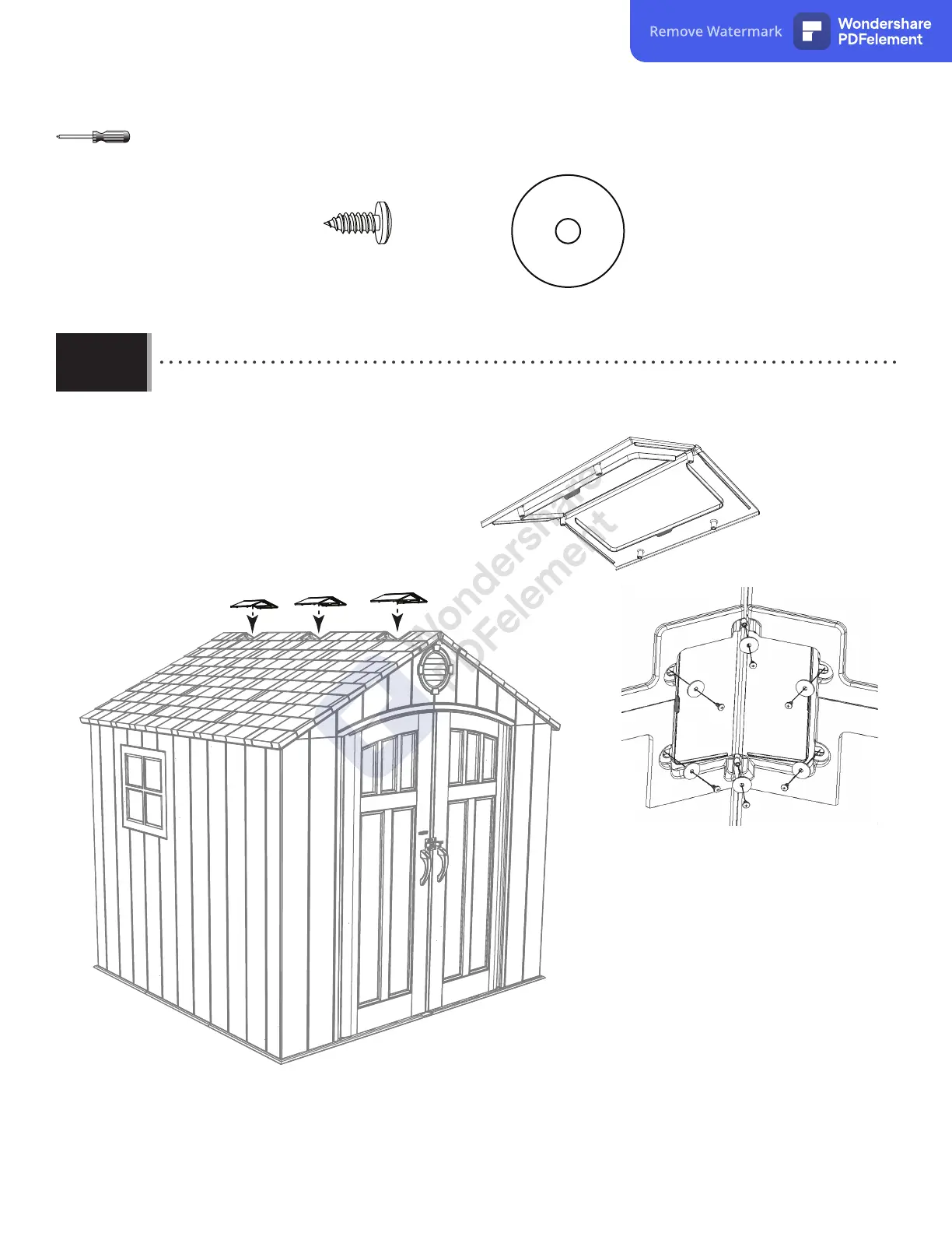 • Plier les Lucarnes (AHC), et attacher-les au toit à l’aide de six (6) vis (ADX) et rondelles (AED) pour chaque lucarne.