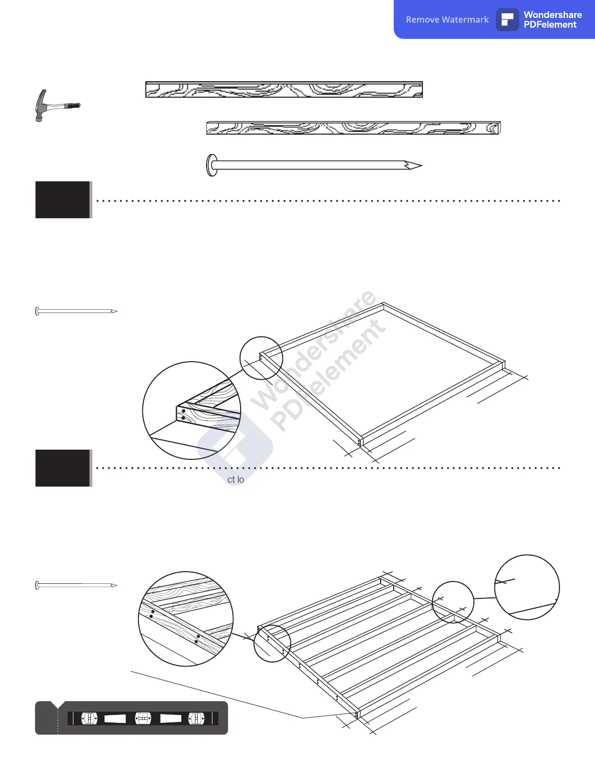 • Ensure all lumber is treated and approved for outdoor use. Build frame to 93 3/4" x 88 3/16" (2,38 m x 2,24 m) (outside