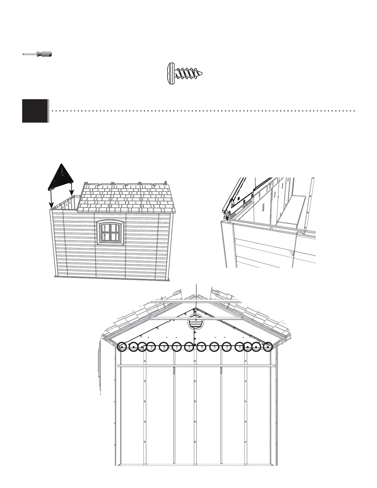 • Attach the rear gable to the shed using fourteen (14) screws (ADZ). Place the end of the gable onto the interior
