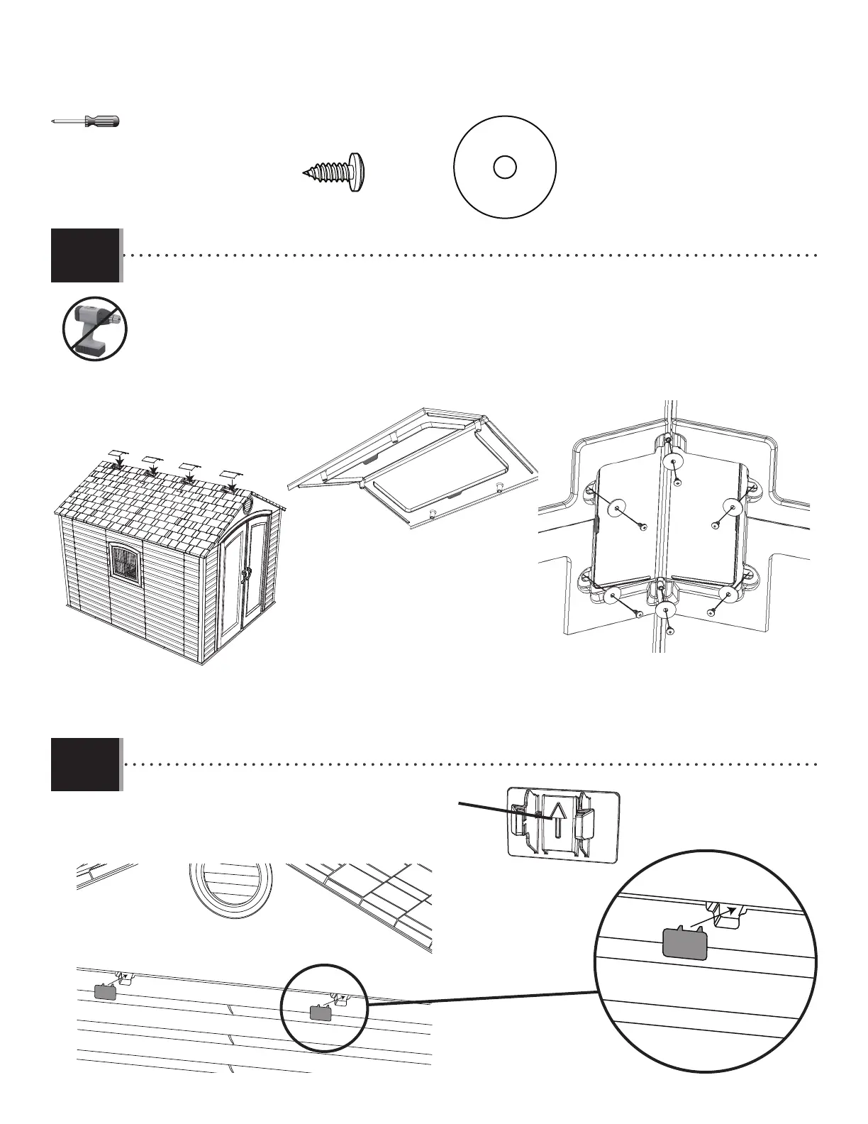 • Plier une lucarne (AHC), et l’attacher au toit à l’aide de six (6) vis (ADX) et rondelles (AED) pour chaque lucarne. Répéter