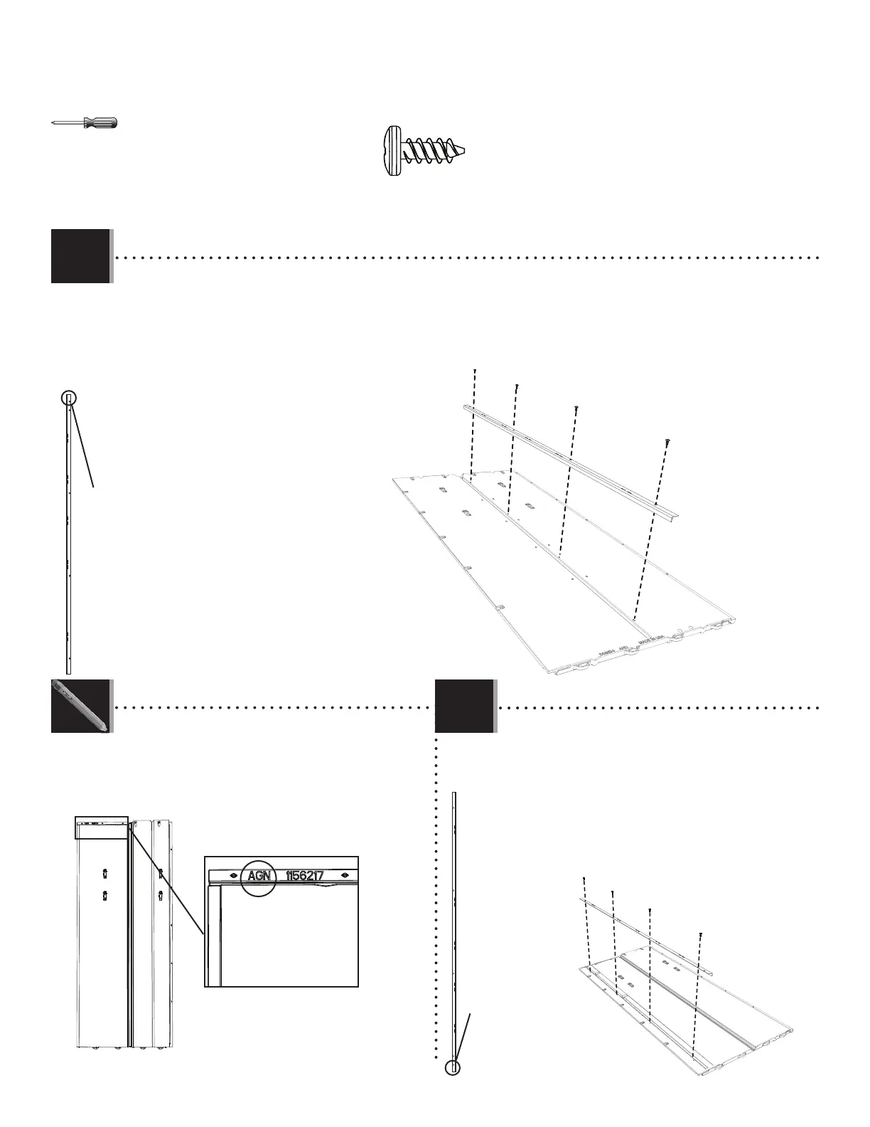 • Secure a wall support channel (AFM) to the center groove of each of the nine (9) wall panels (AHD) using four (4) screws (ADZ) for