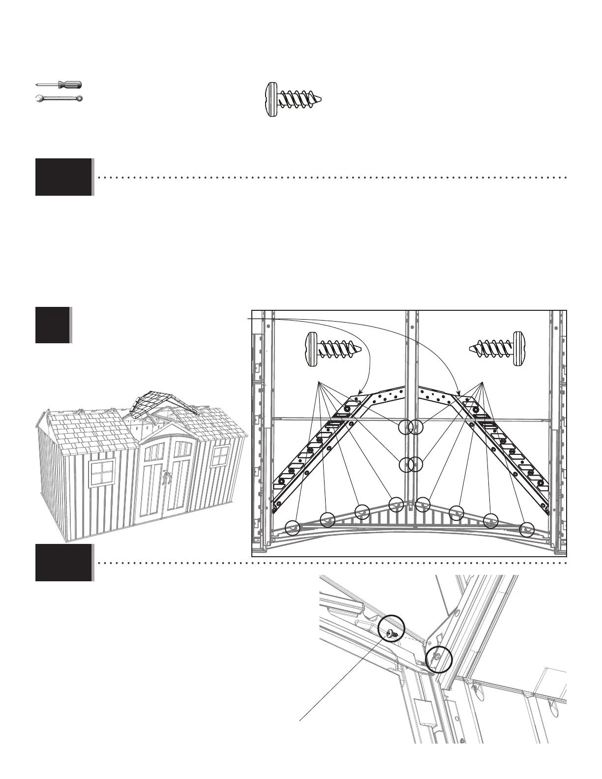 • Fold the ends of the large angled roof panel (DRA) and set it down onto the shed as shown. Secure the panel to the