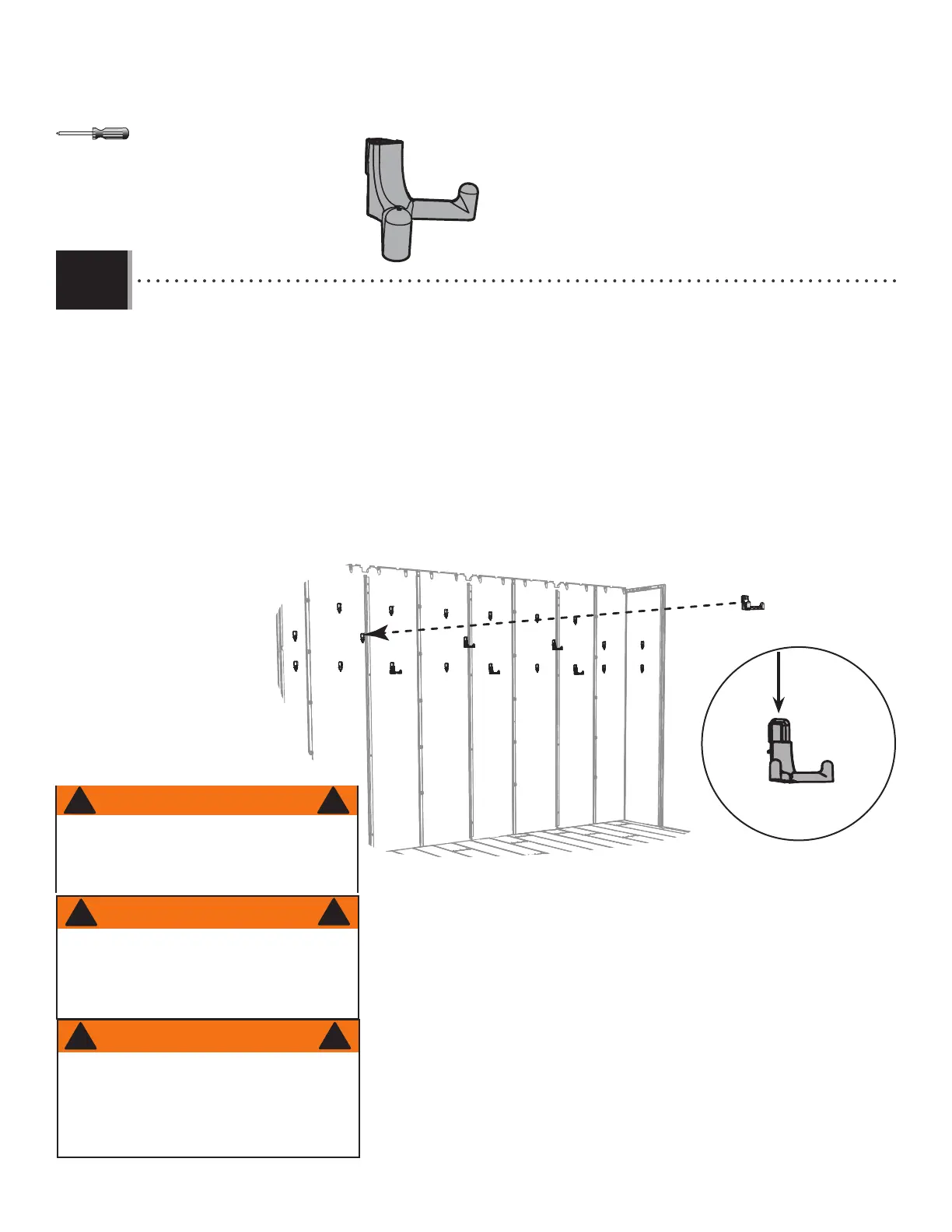 • Insert the twelve (12) wall hooks (EDL) into any of the notches in the wall panels (either side of the shed). Then push