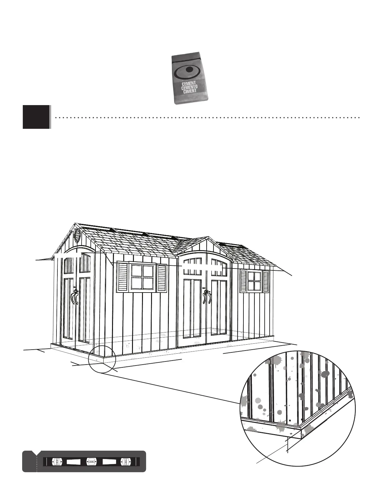 • The concrete should be approximately 4" (≈10,2 cm) thick. The actual dimensions of the shed, at its widest