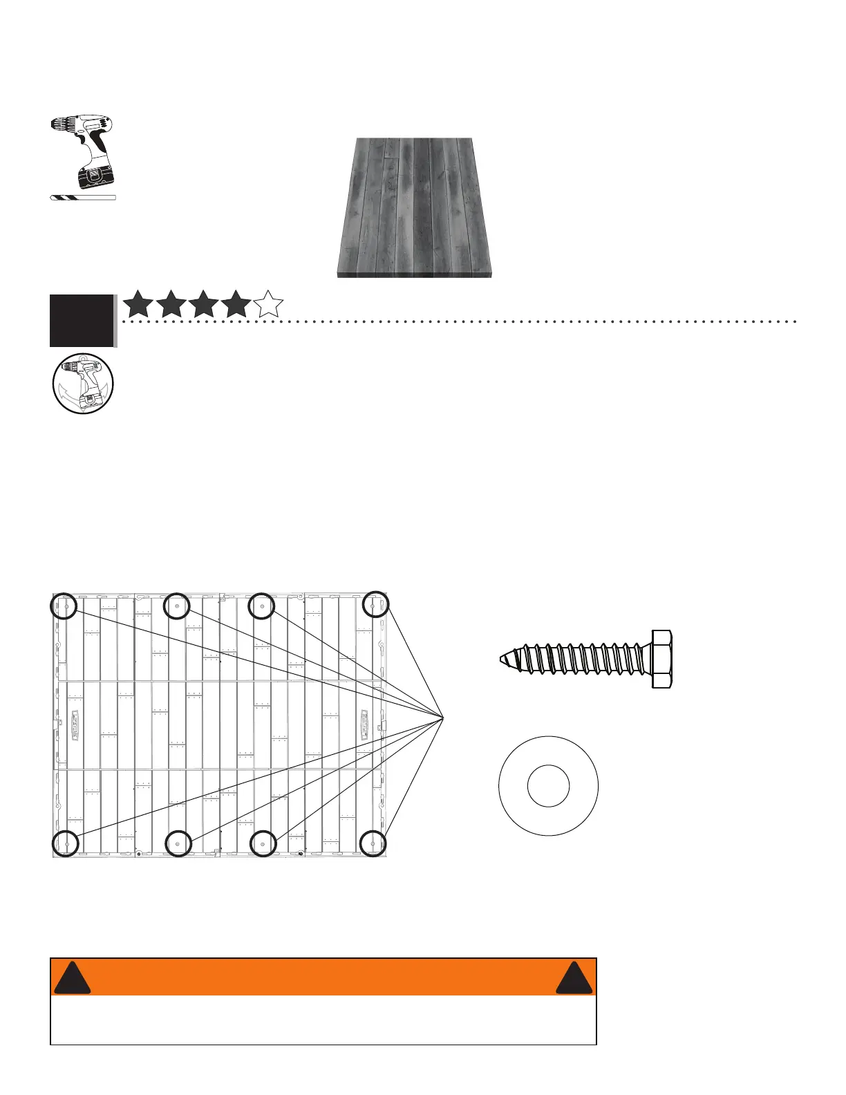 using a drill, 5/16" (≈8 mm) drill bit, eight (8) 3/8" x 1 1/2" (≈10 mm x ≈4 cm) Lag Screws and eight (8) 3/8" x 1"