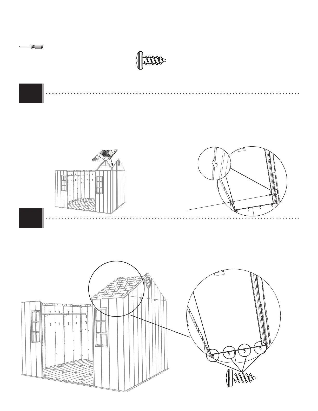 • Align the four holes in the wall panel with those at the bottom of the roof panel, and insert four (4) screws (ADZ) to