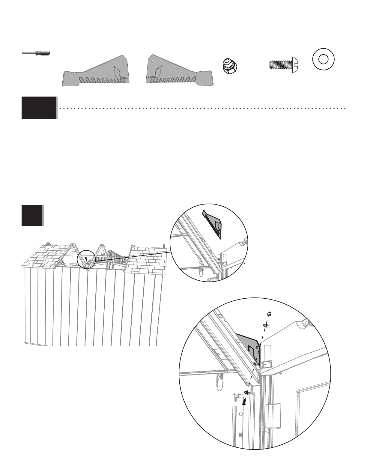 the truss as shown. Secure with the hardware provided. Only tighten by hand for now.