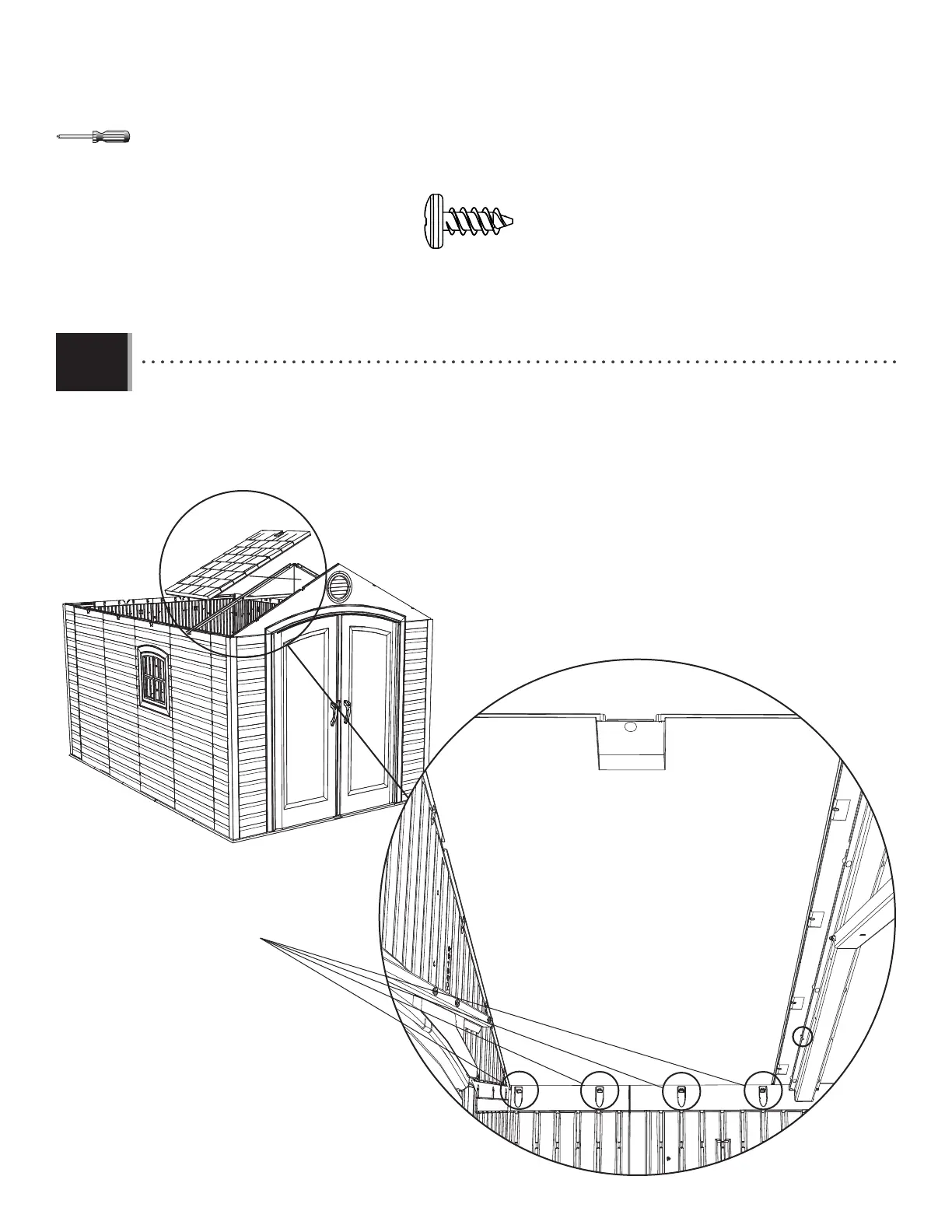 • Align the four holes in the Wall Panel with those at the bottom of the Roof Panel, and insert four (4) Screws (ADZ)