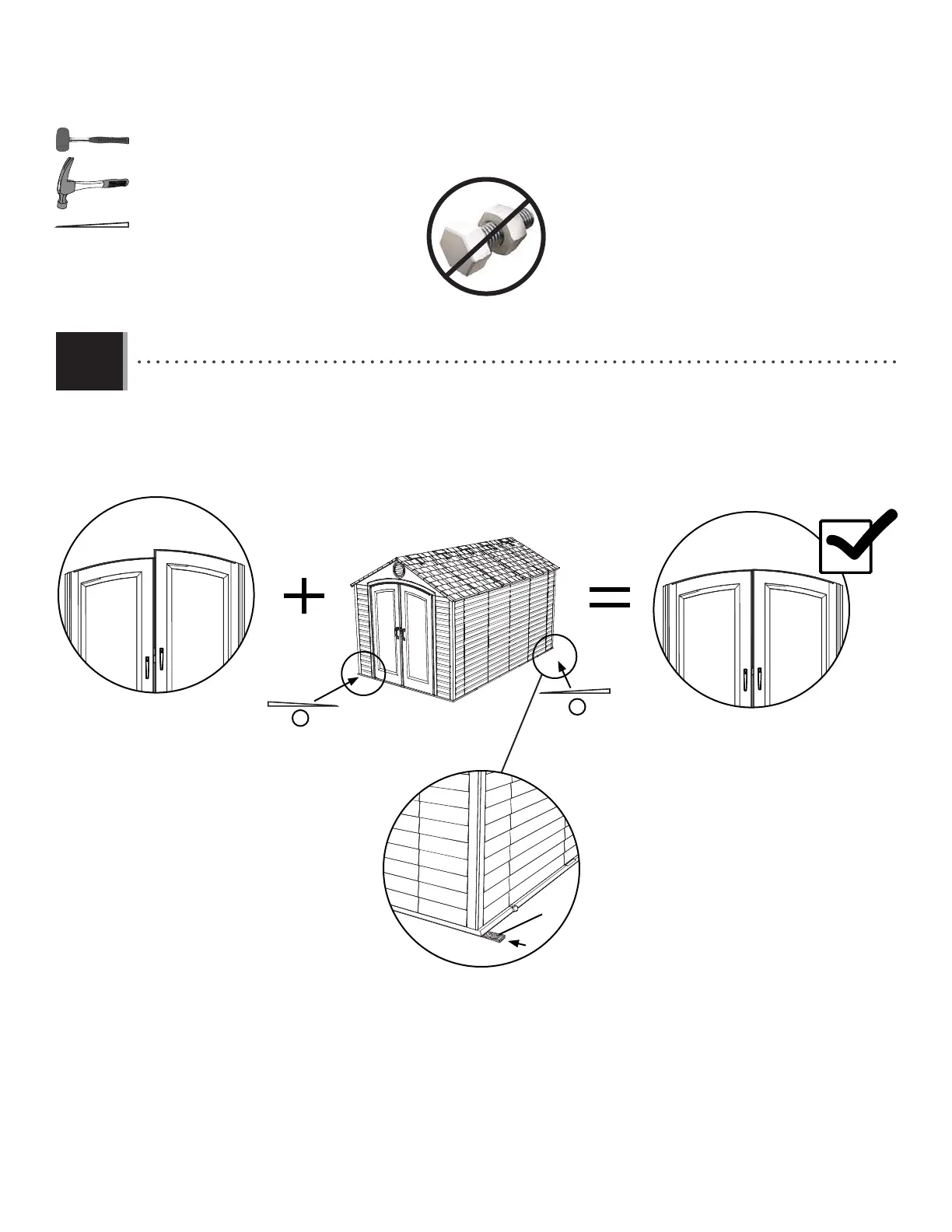 • If the Right Door is higher, insert a Shim (AIX) underneath the left, front and right, rear corners of the Shed until the