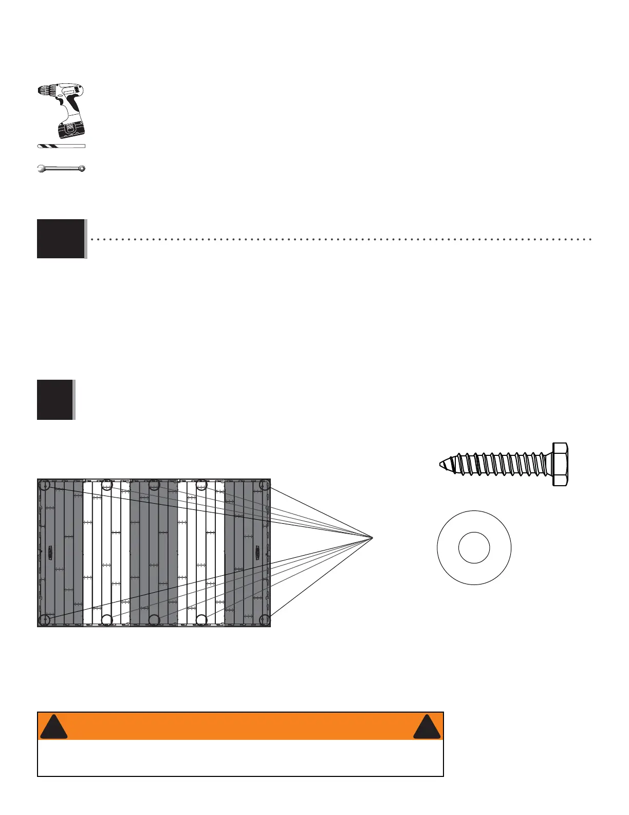 recommend using a drill, 5/16" (8 mm) drill bit, ten (10) 3/8" x 1 1/2" (10 mm x 4 cm) Lag Screws and ten (10)