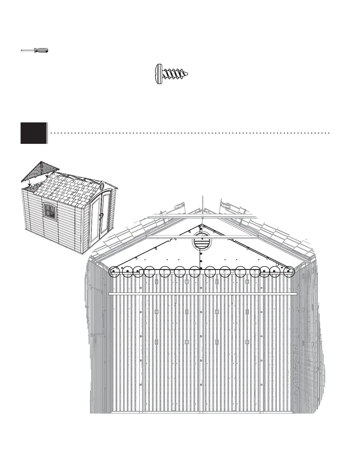 • Attach the Rear Gable to the Shed using fourteen (14) Screws (ADZ).