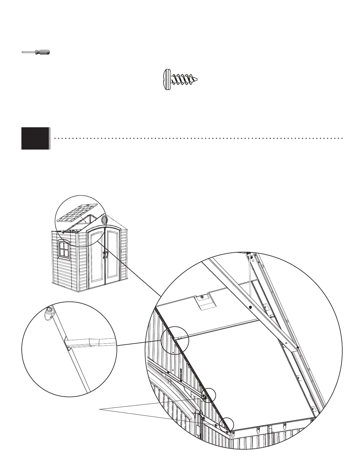 • Insert the fi rst two Screws (ADZ) through the Gable and into the Roof Panel at the locations shown. Insert the Roof