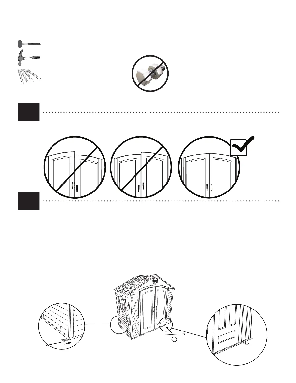 the bottom corner of the Right Door and/or the left rear corner of the shed. If necessary, repeat for the Left Door