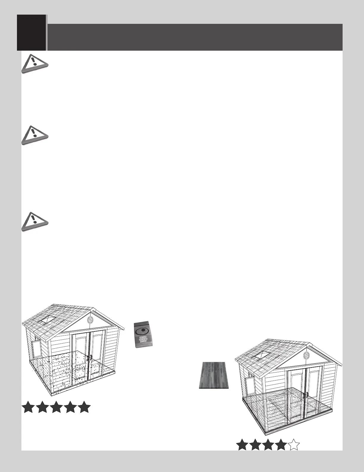 fl at, the shed will not assemble correctly. Proper surface leveling will save you time in the long run, so please do not ignore
