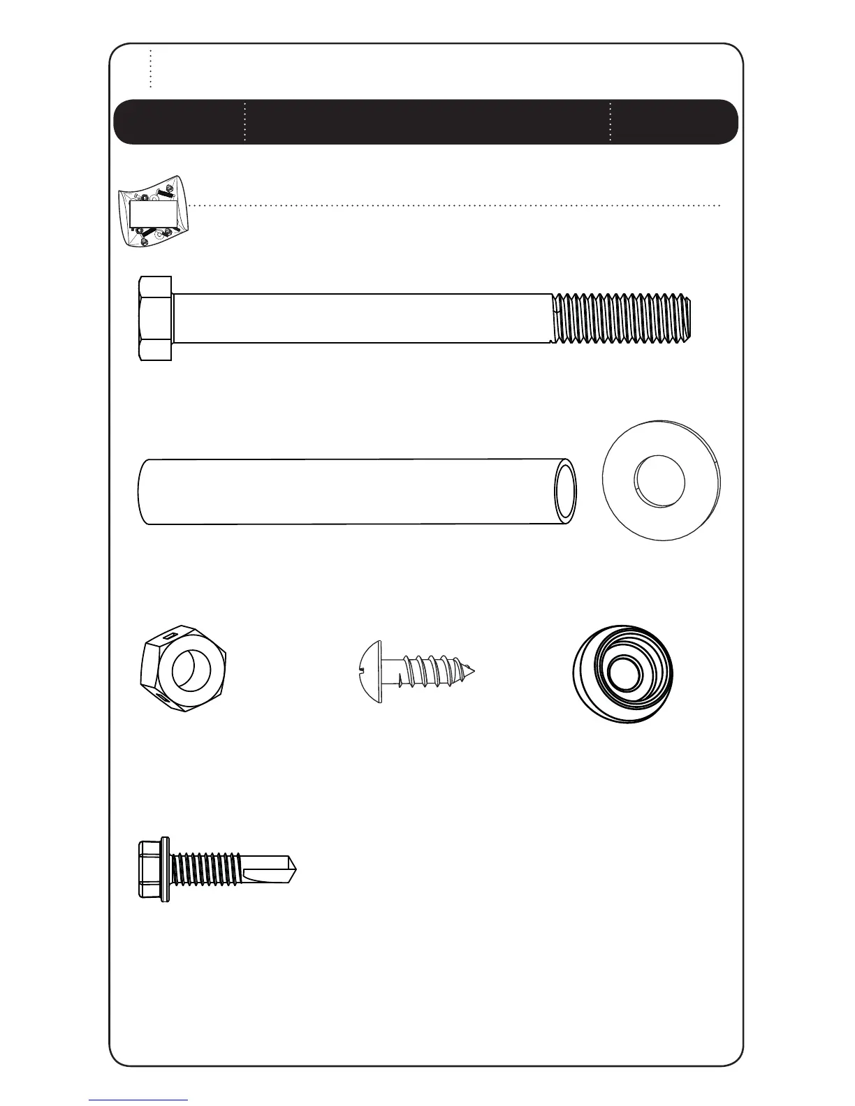 *Only one of the Domed Countersink Washers (CIH), #14 x 1” Self-Tapping Screws (ABZ) and 1/4” x 3/4”