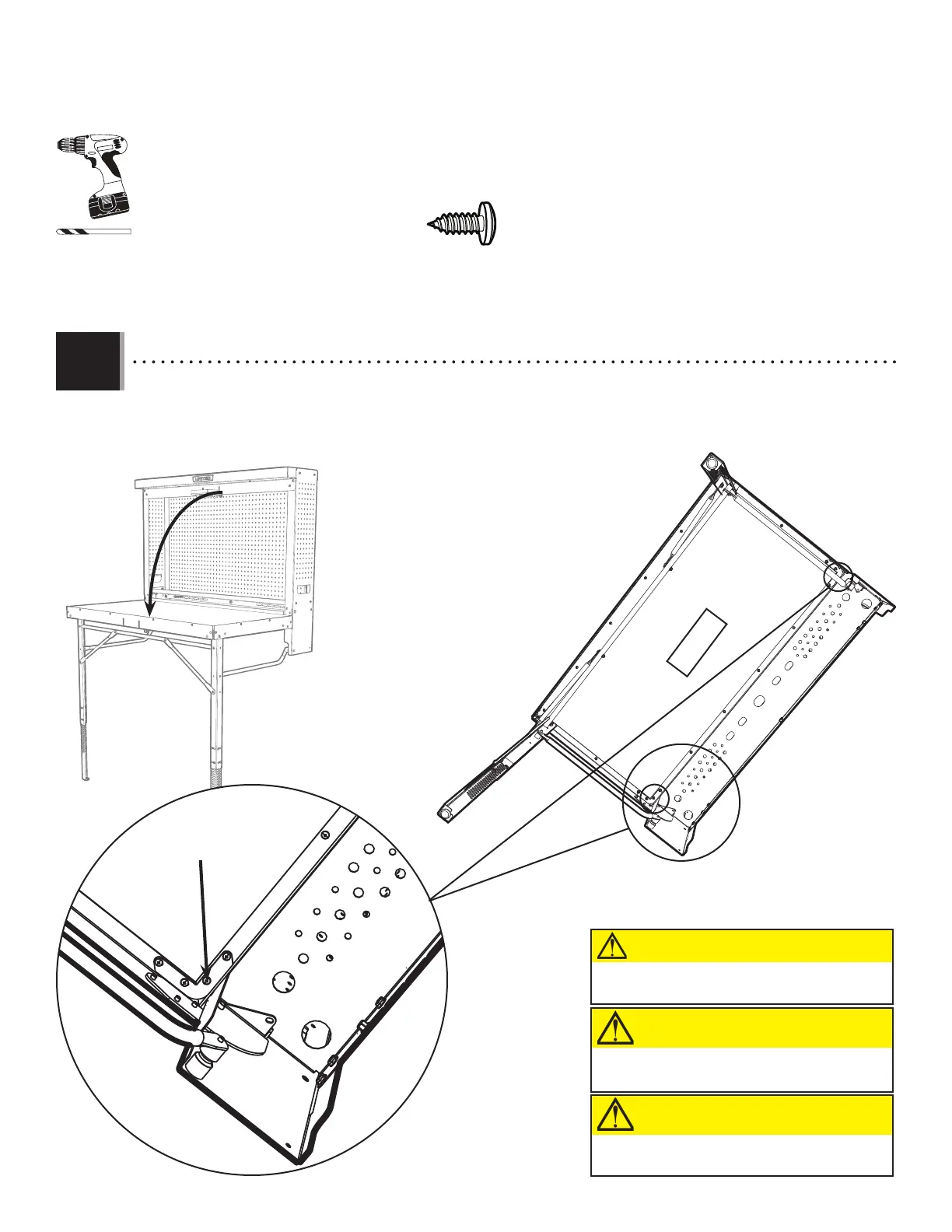 • Dépliez complètement la table de travail. From underneath, percez et insérez les deux (2) dernières vis (ADX) dans les supports