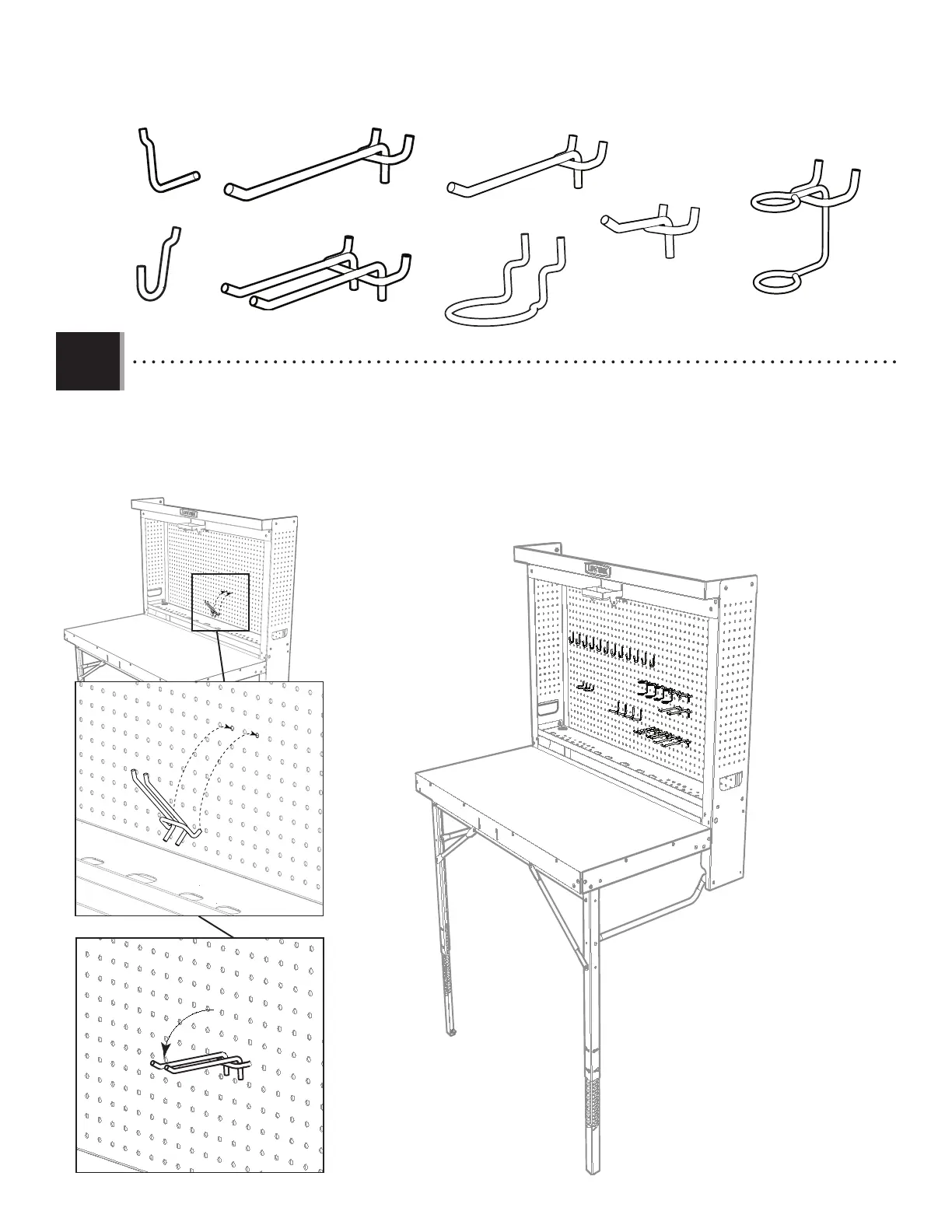 • Insert the various Hooks (ESK, ESL, ESM, ESN, ESO, ESP, ESQ, ESR) into the rear and/or side Pegboards. Where you insert