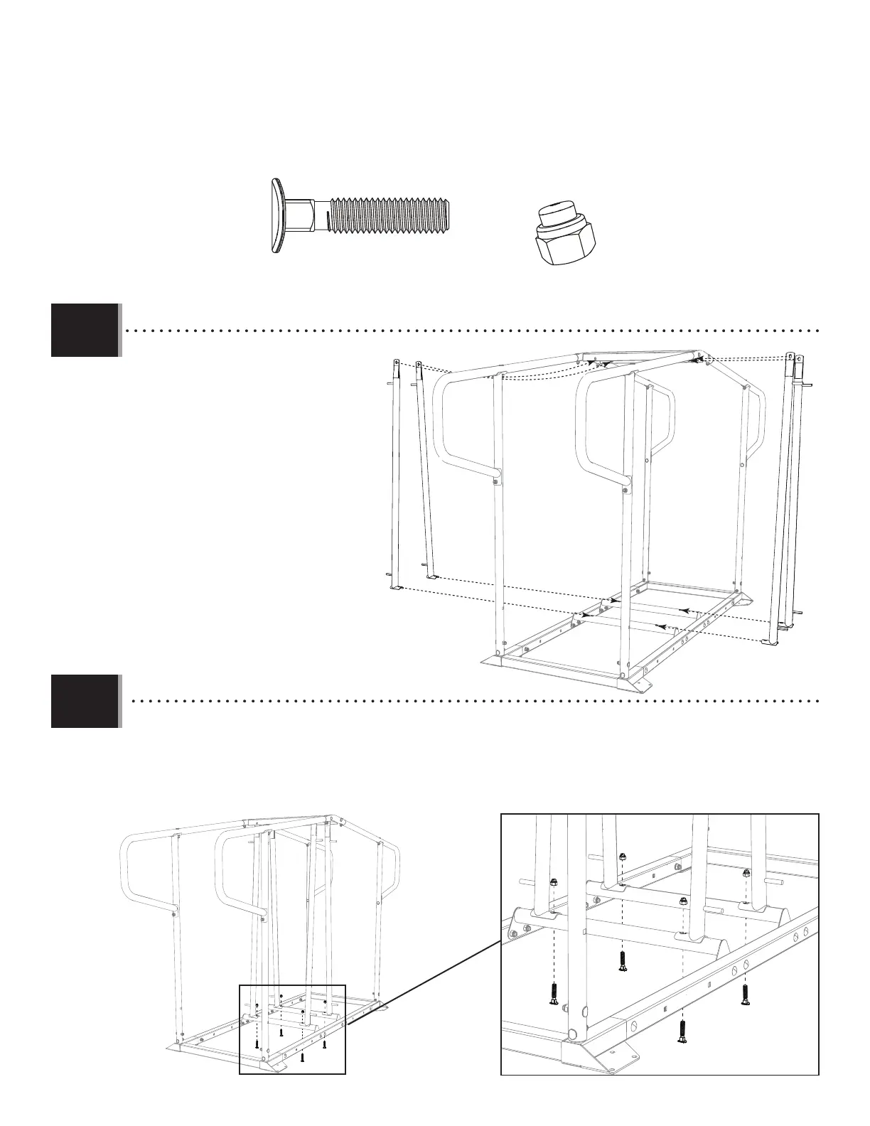 • Secure the Inner Support Tubes to the Lower Cross Braces with the hardware indicated. Tighten only by hand at this