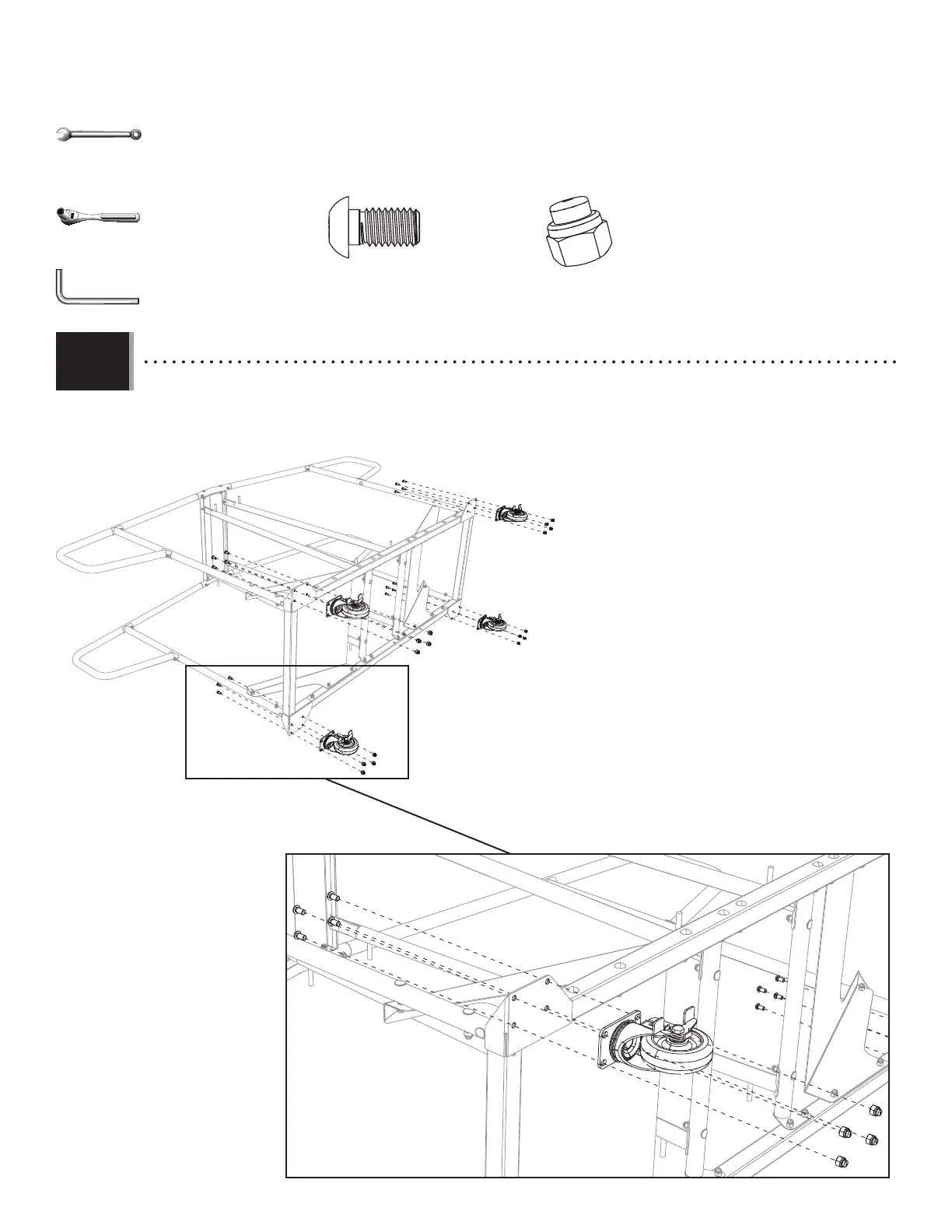 • Secure the Castors (AMU) to the corners of the Base using the hardware indicated. Tighten all hardware now.
