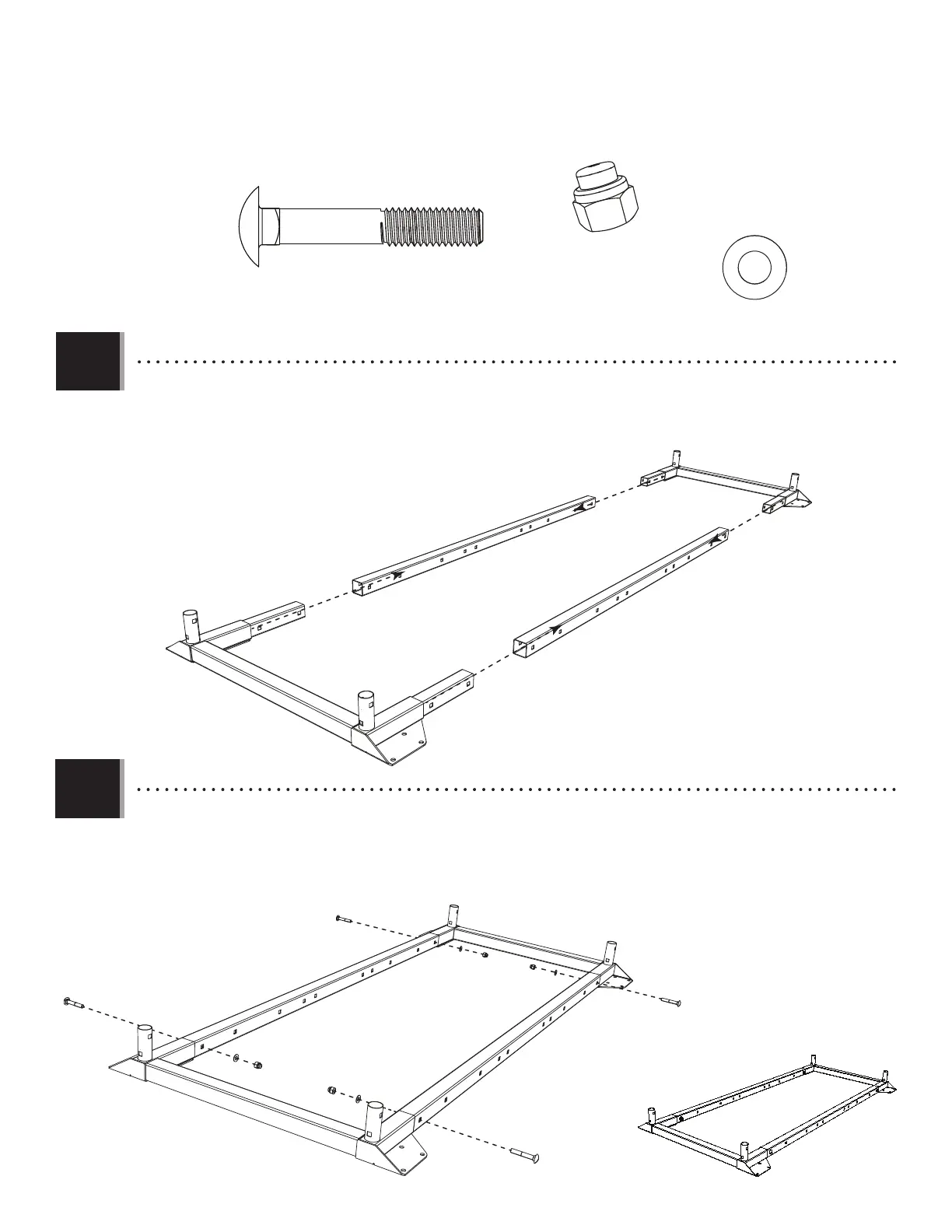 • Secure the End Weldments to the Side Tubes with one Bolt (EVW), Washer (DBA), and Cap Nut (EVV) at each end.