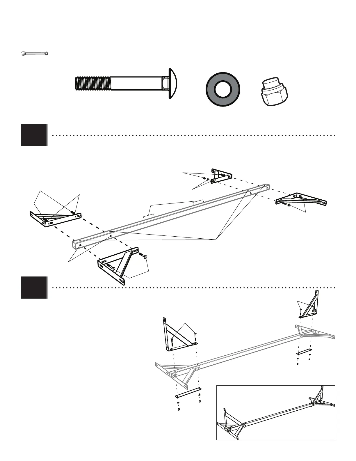 • Attach four Triangular Gussets (FNX) to the Horizontal Base Square Tube (FNQ) using the hardware indicated. Finger tighten only.