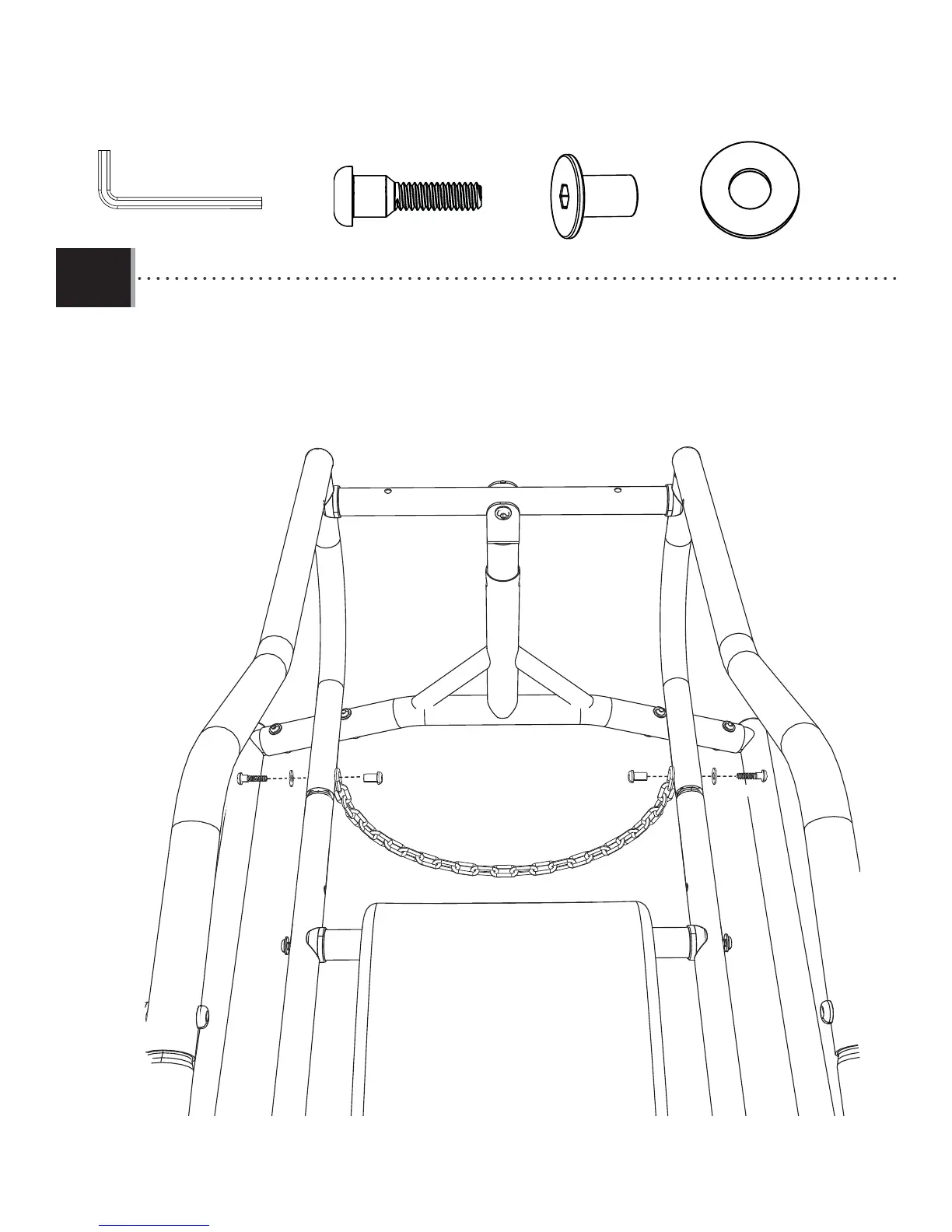 Secure the Chain Foot Rest (CQL) to the Fuselage with the hardware shown by positioning the chain links over the holes
