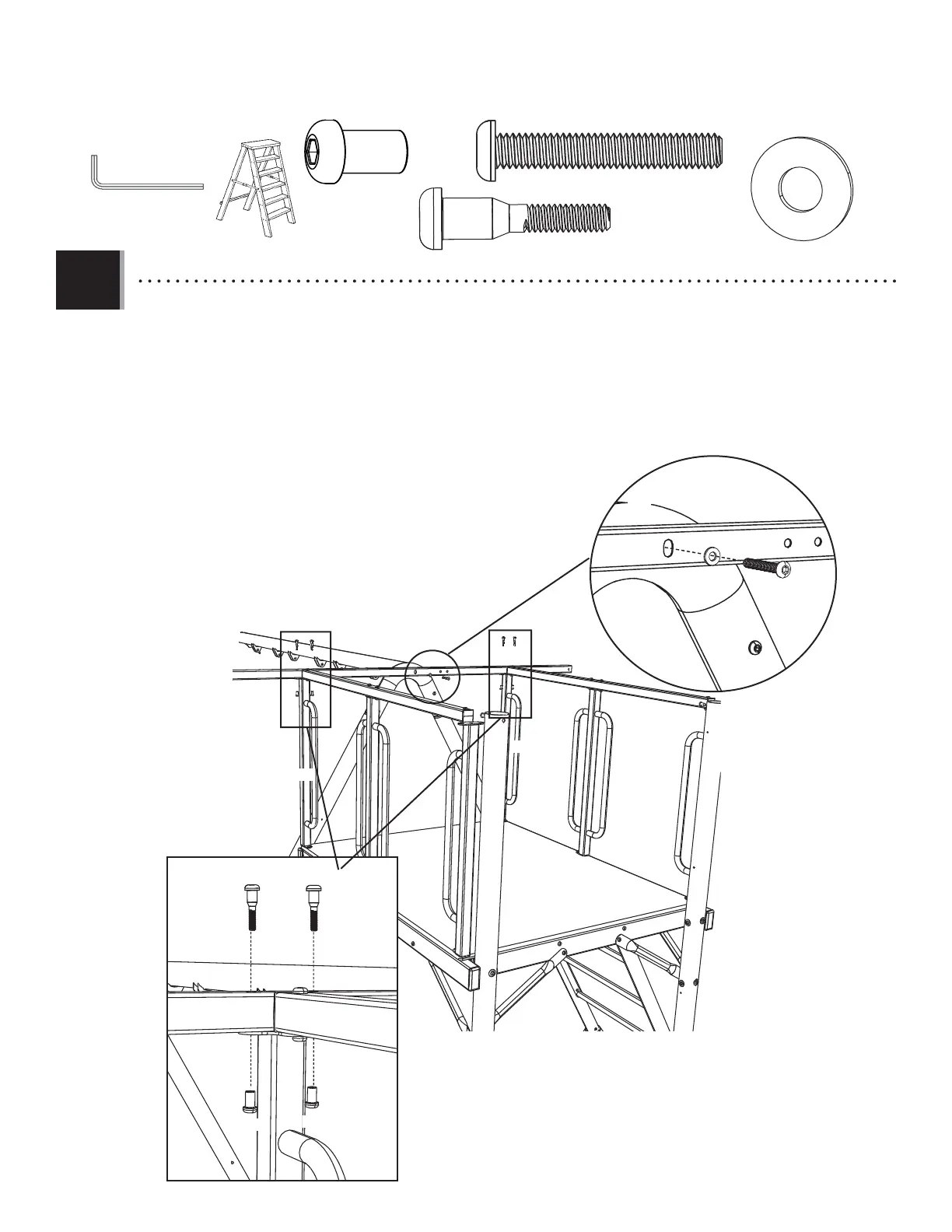 Attach the A-Frame Roof Tube (CBV) to the One-Handle Rails (CBS) and the Swing Bar (CBO) with the hardware shown in