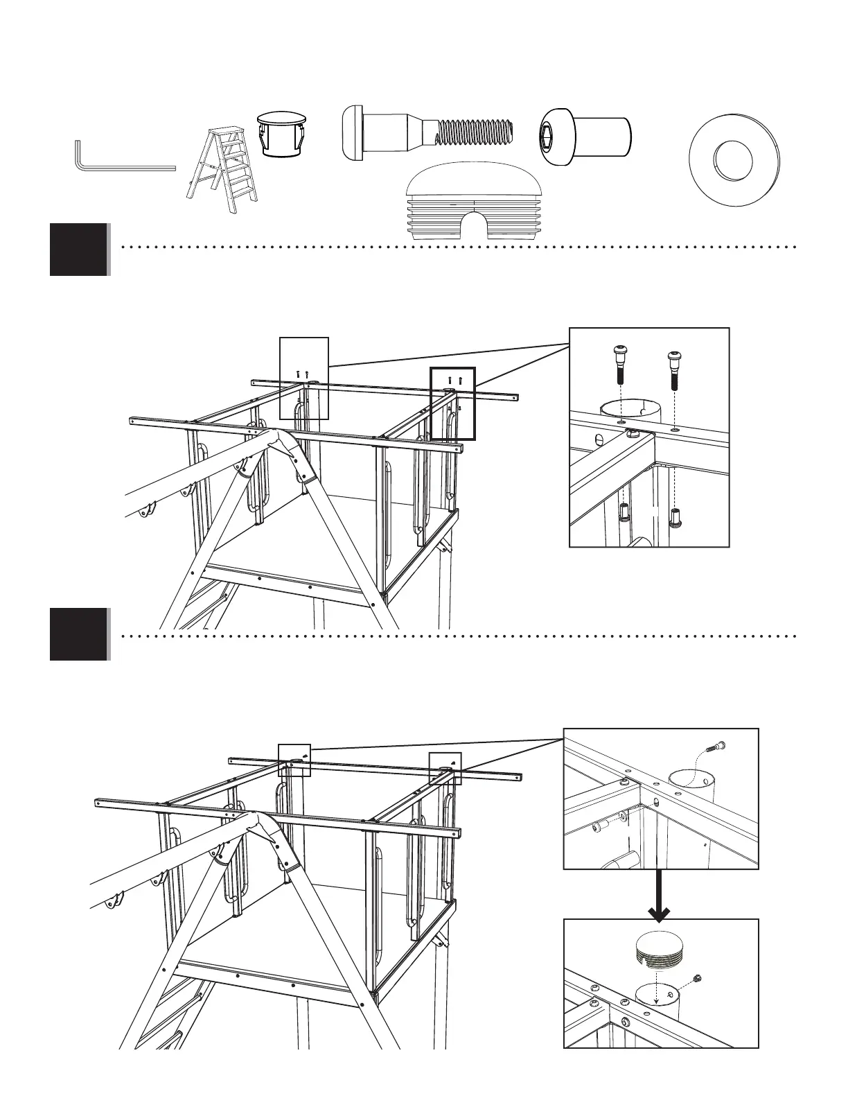 Secure the Climbing Wall Deck Tube (CBW) to the One-Handle Rails (CBS) with the hardware indicated.