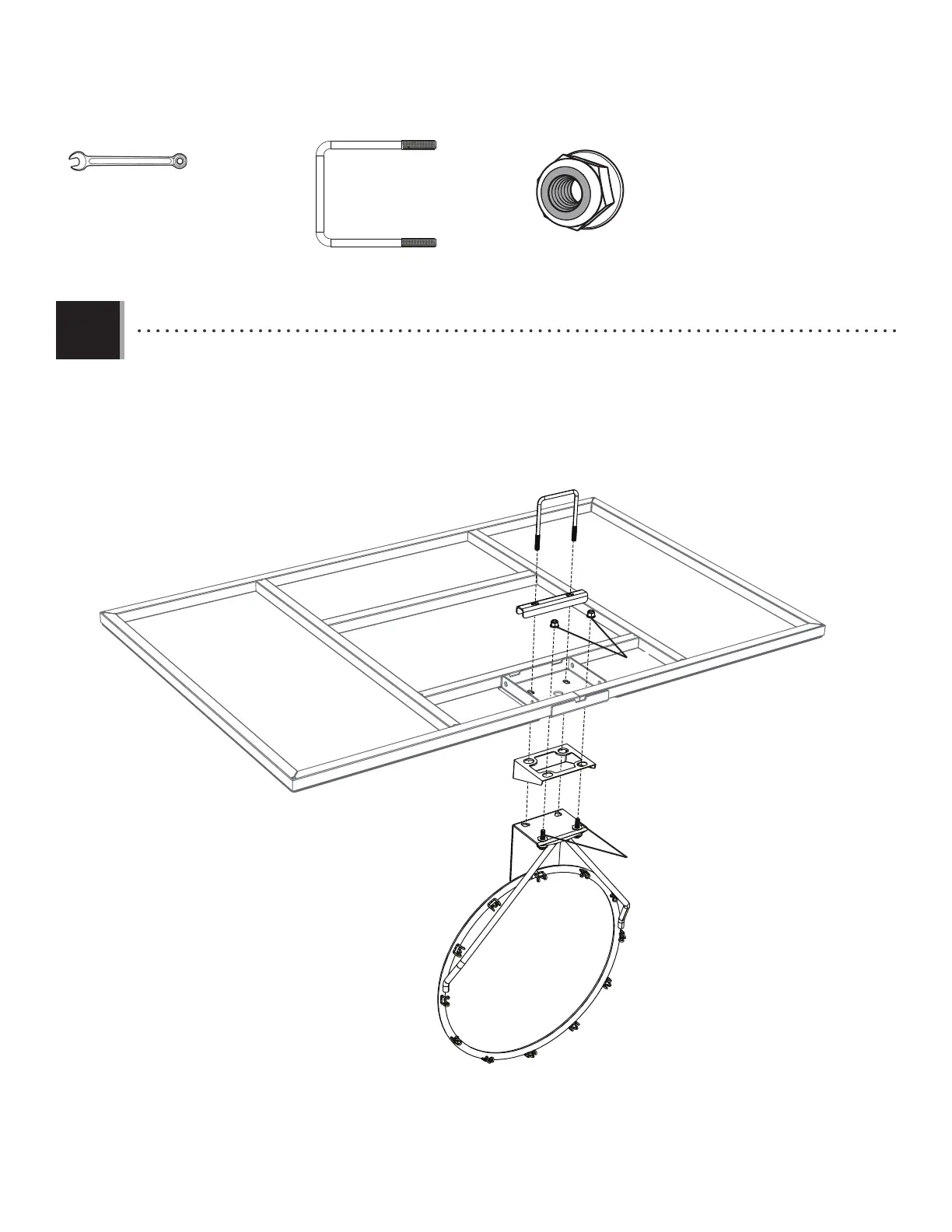 • Connect the rim (ALX) and plastic guard (ALD) to the backboard (AJI) using the U-bolt support bracket (DFD) and the